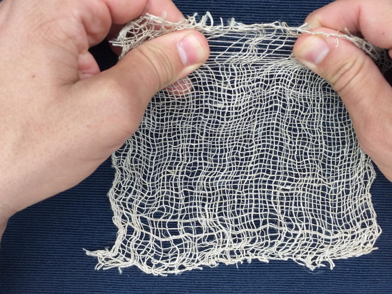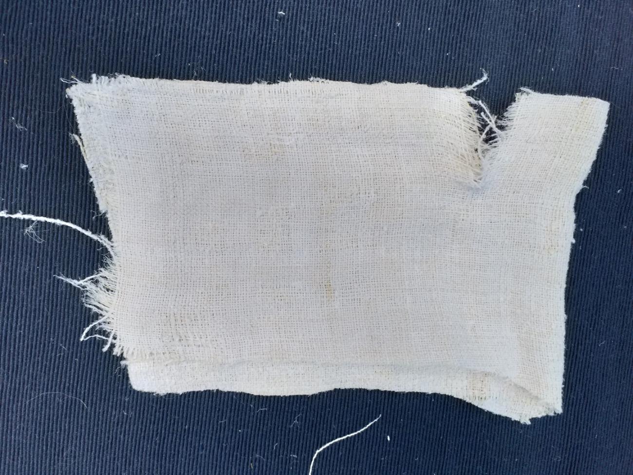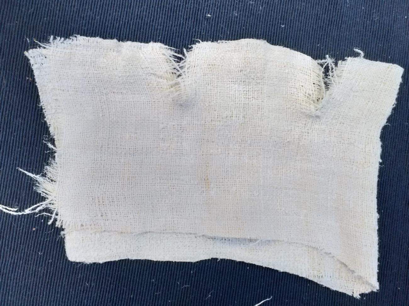 Since we did not have a worn linen fabric with a similar yarn thickness, we chose a hemp fabric for the next experiment. The piece of hemp cloth shown below has a comparable yarn thickness, it is hand-made unworn fabric. Its fragility and gauze (“net-like”) appearance is caused by the fact that it is almost 80 years old. Hemp was available and used during the period under study, so we will use it (despite Helmold’s report) (See Figure 9).