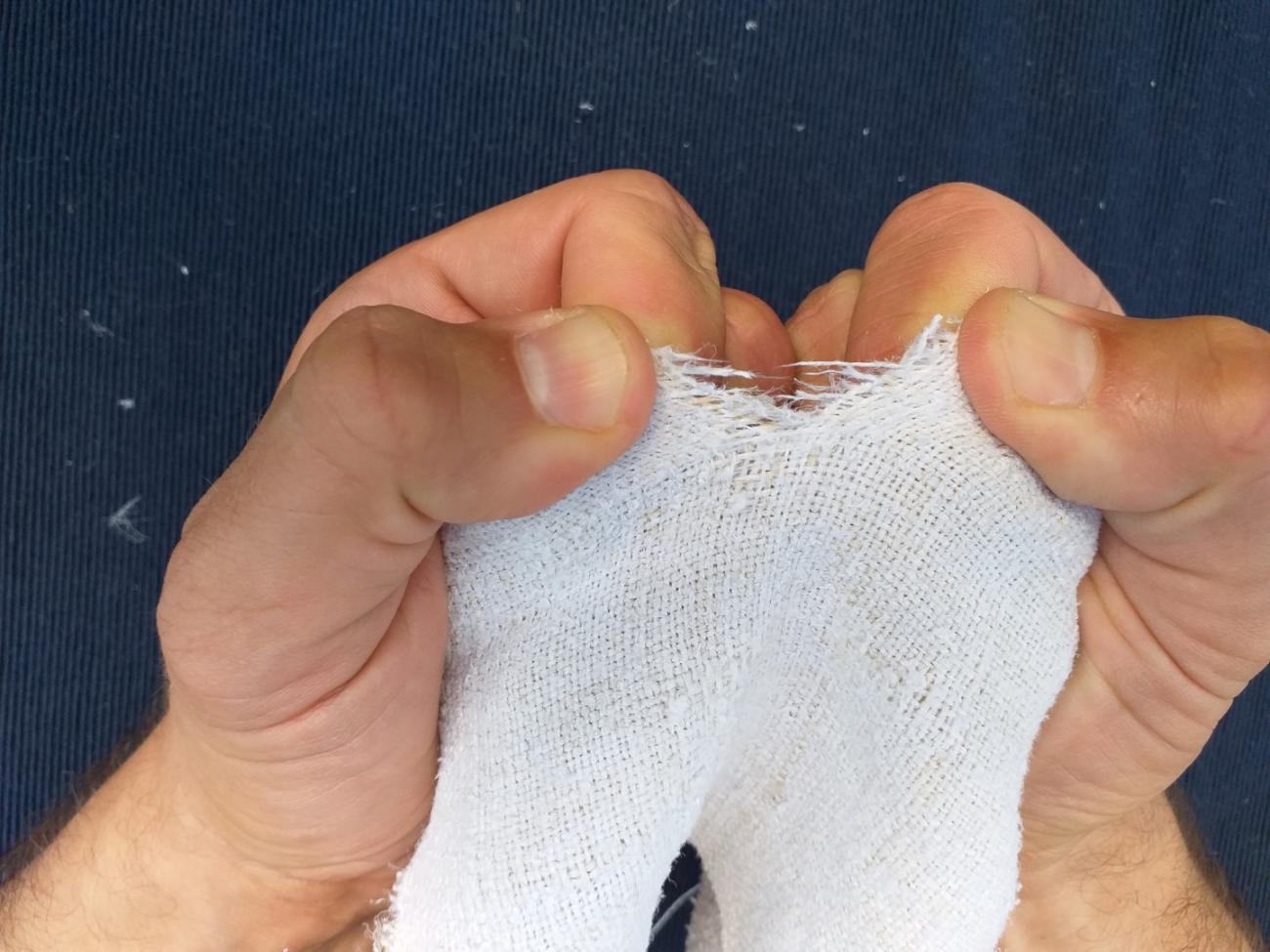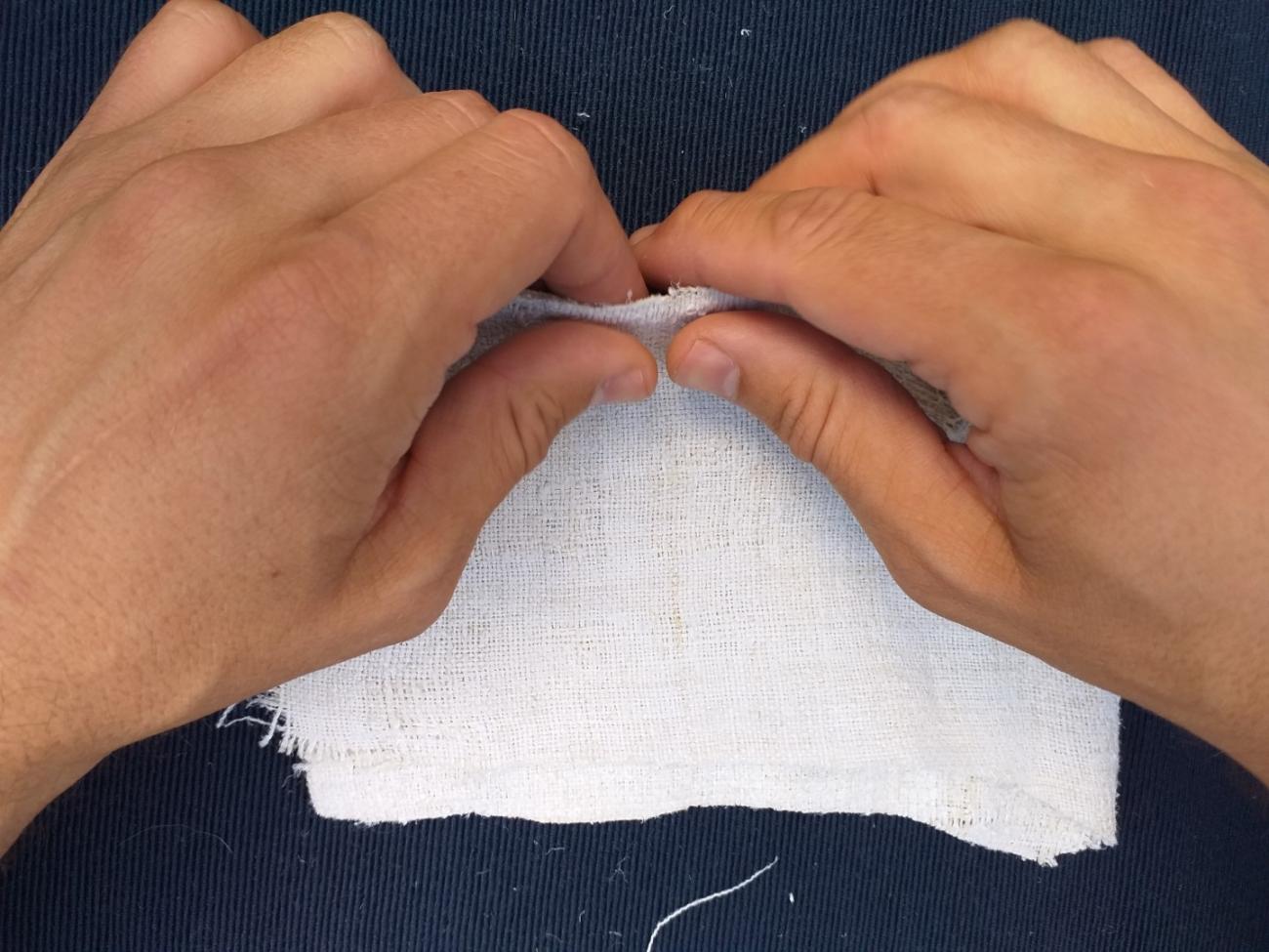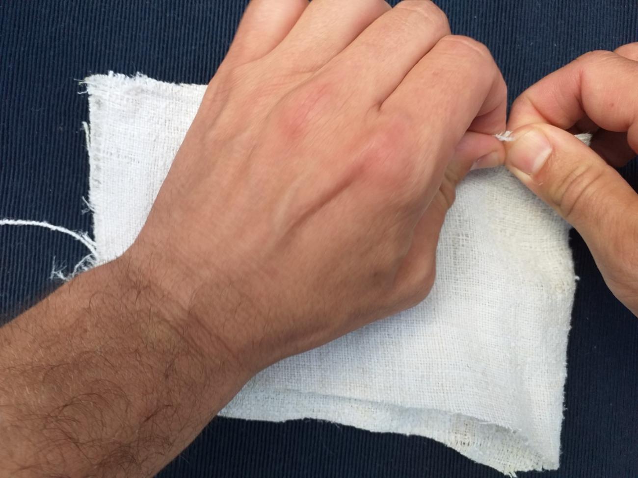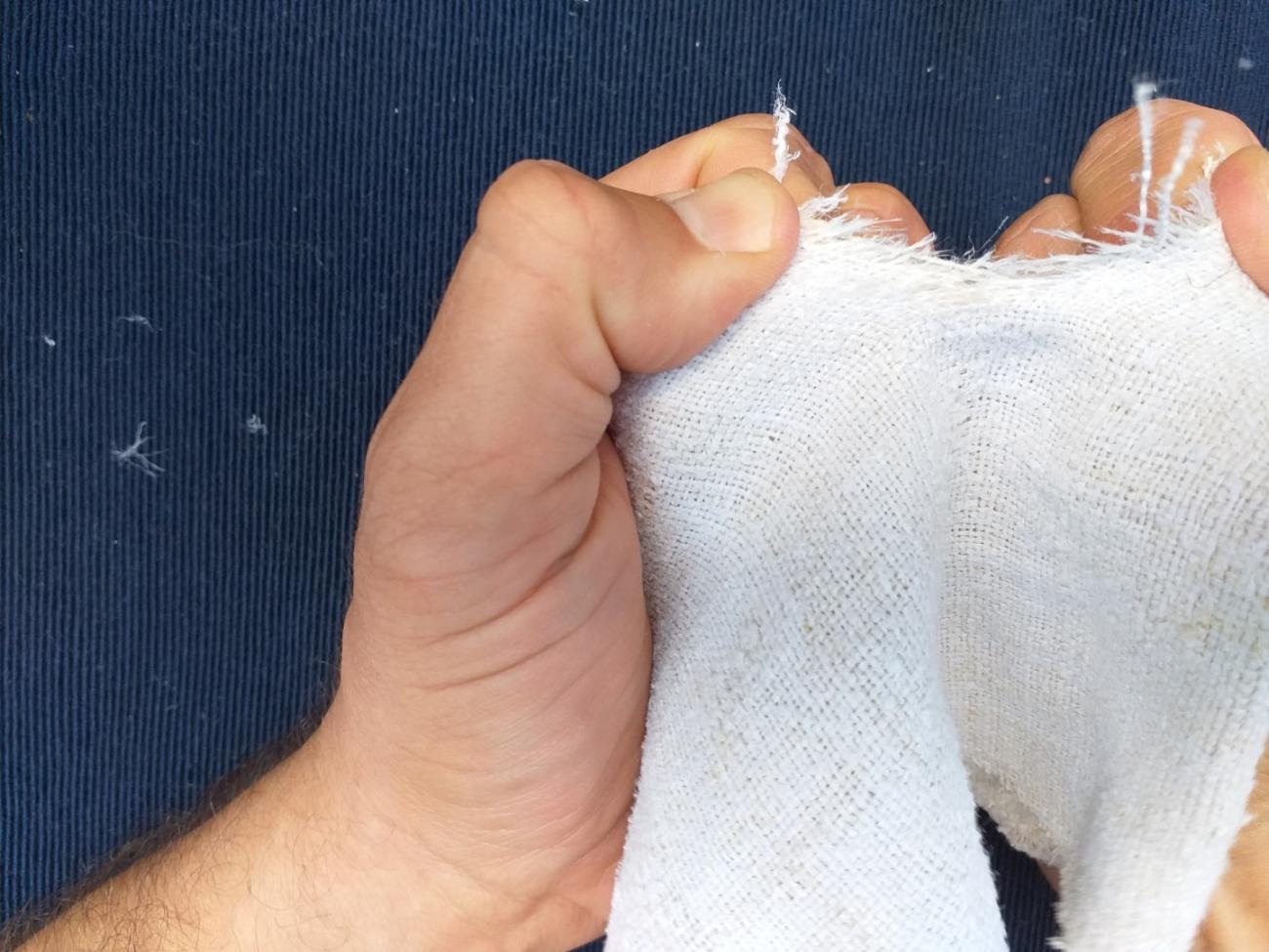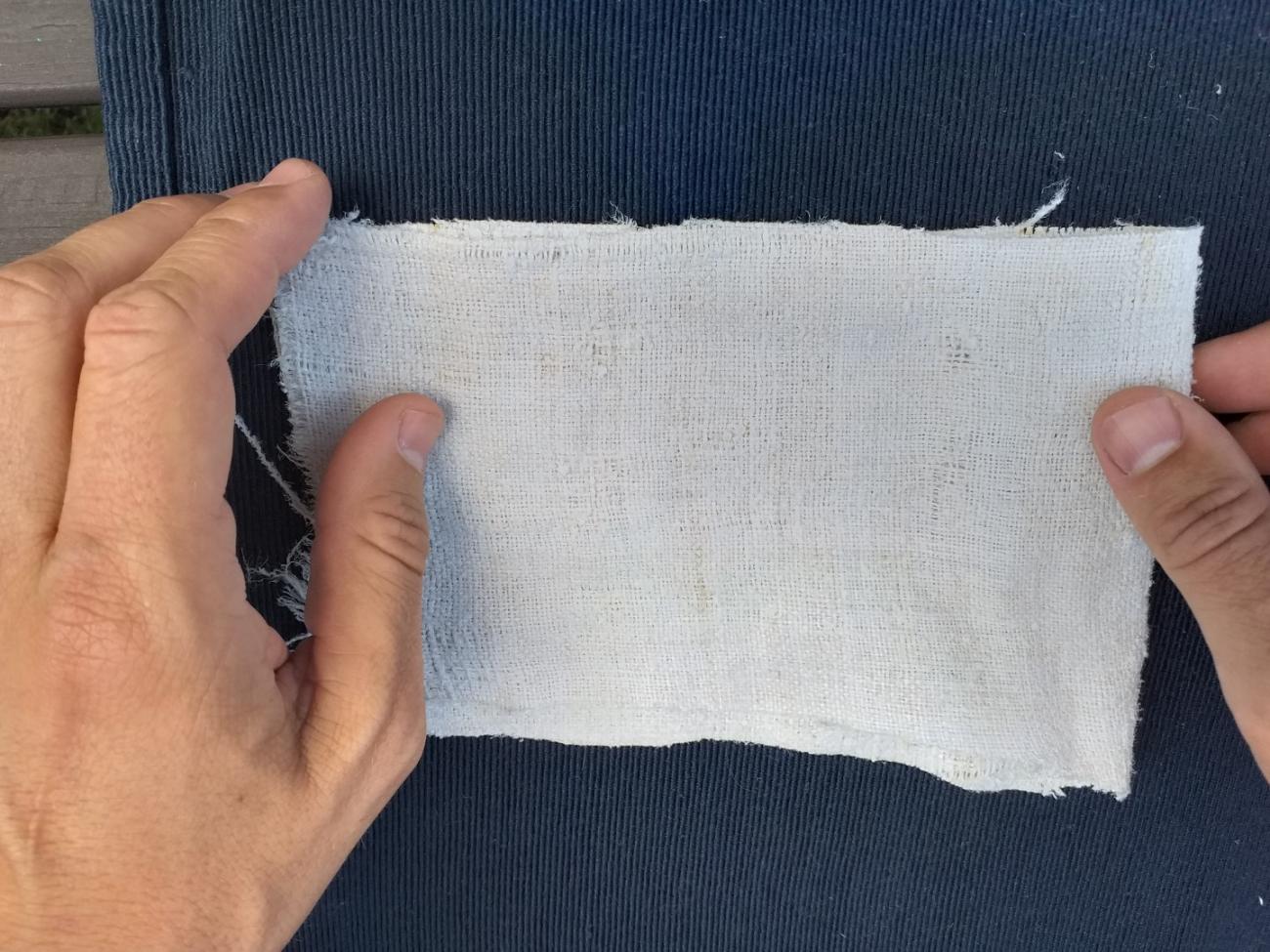 The material itself is not so important, but it is important to demonstrate the functional principle. We assume that sufficiently old and worn linen would behave similarly. The cloth is fragile enough to be used to demonstrate an act of *tъrgati platъ under the proposed hypothesis (See Figures 10-16).