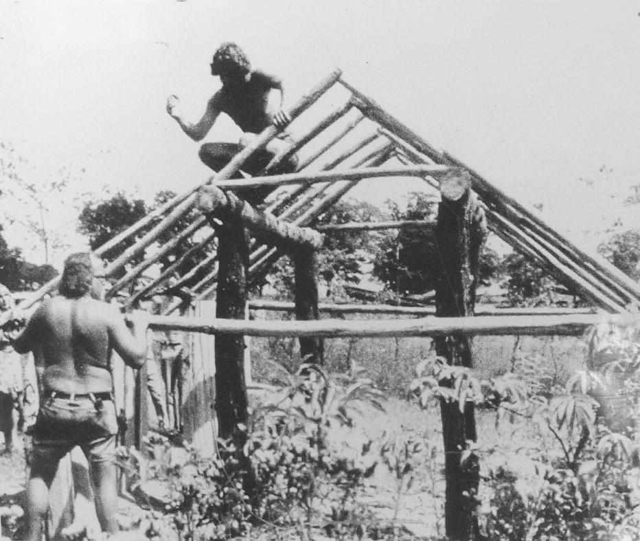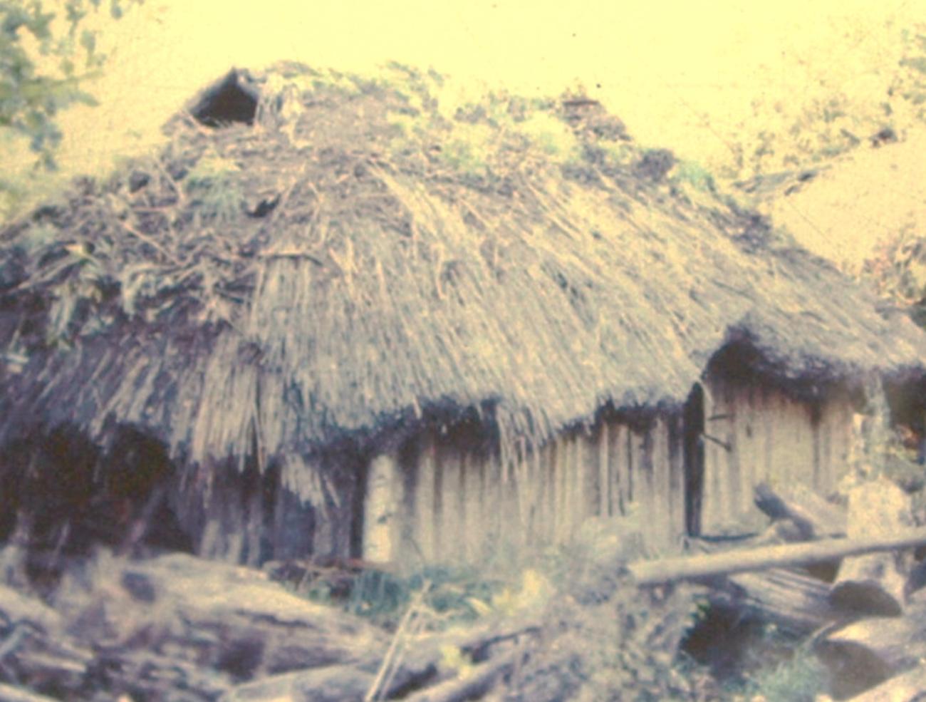 The decayed house is house no. 1, which was built in 1971 as the first one on the museum grounds, but outside the original medieval settlement area. It does not follow any archaeological features and was only built for the purpose of learning building techniques. The house was erected by a group of Danish scouts (See Figure 1), which is why it is also listed as the 'Viking house' in the Düppel-History by D. Todtenhaupt (2015). The construction method and the building material can be described as follows: Parallel post-construction with posts made of birch trunks, into which purlins are mortised; the rafters rest on the two purlins. The construction is supported in the roof truss and in the lower area by cross battens, at which oak split planks in tongue and groove joint form the walls. The roof was covered with reed (See Figure 2). A floor was not laid.