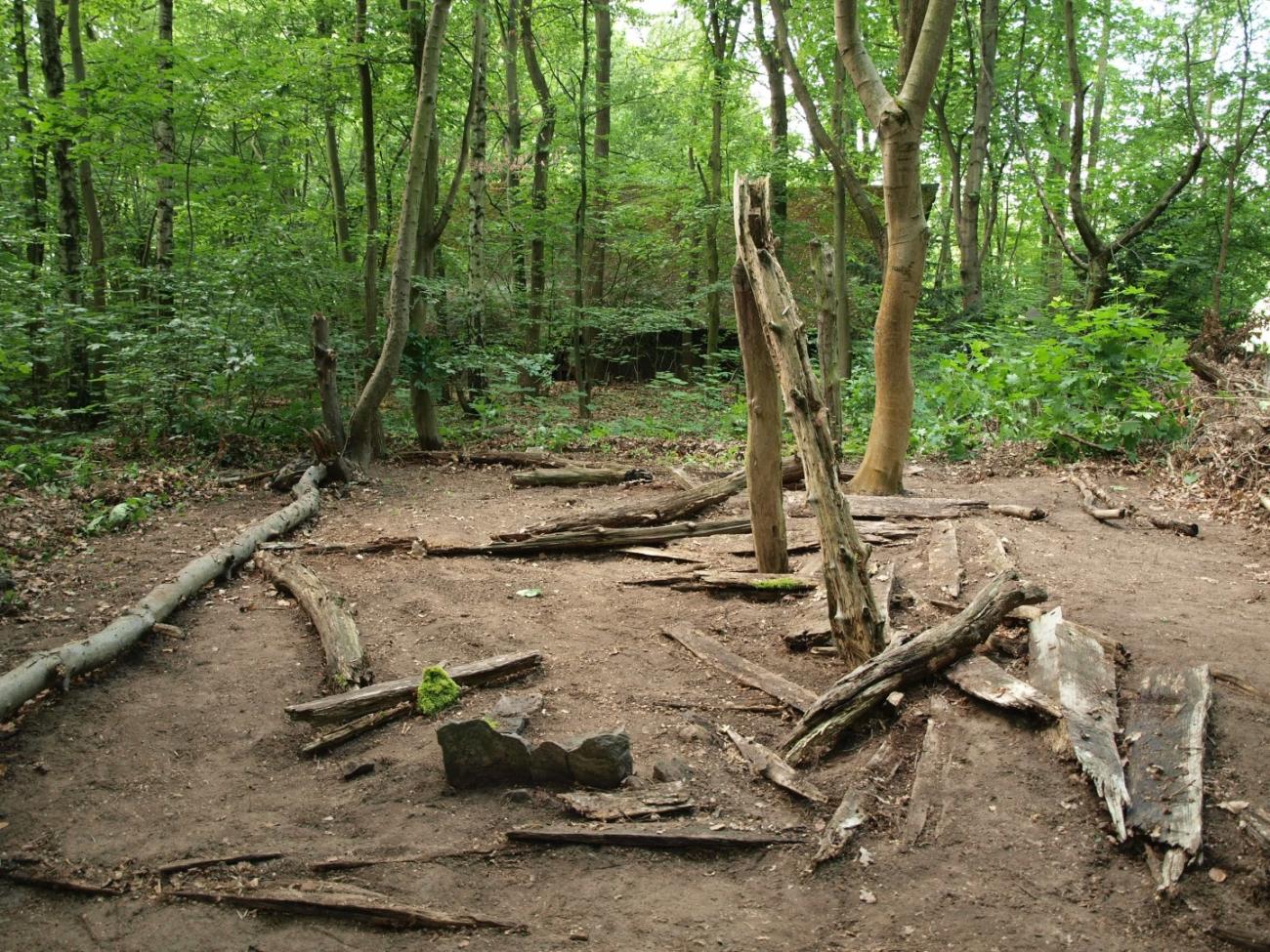 In the end, the non-organic materials, such as the stones of the fireplace and the small iron objects, will probably remain from the house. The fireplace would presumably also be addressed as such from a prehistoric finding, while the exact function of the small iron objects can already only be speculated about. The different intensity of the decomposition processes on the different timbers can be clearly seen; some oak split planks are much better preserved than the posts and purlins made of birch wood. This is probably also because oak has natural resistances, which has a positive effect on its durability. Its own sap keeps vermin away and its unusual hardness and elasticity determine the high quality of its heartwood, as shown here by its resistance to decay. It is questionable whether the lack of natural (organic) cover will cause wood structures to show up in the form of discoloration or the post holes in the existing soil. In the future, the removal of leaves and of natural growth should be avoided. This is an artificial intervention in the natural soil formation processes and the processes of decay and decomposition, which are determined by the directly prevailing environmental conditions in combination with the microclimate of the woodland.