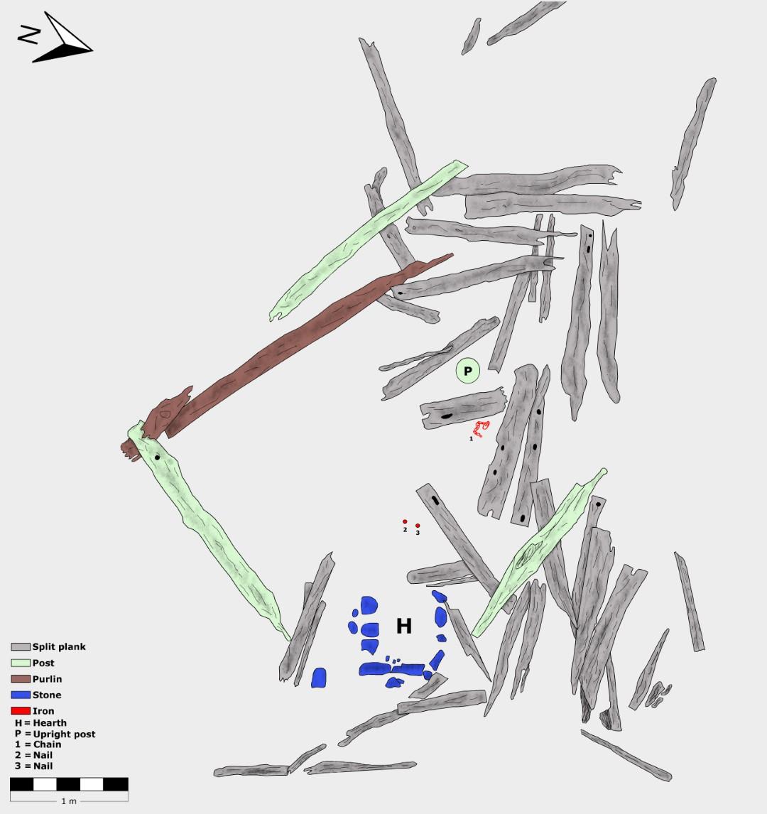 Most of the various types of construction timber have not yet decomposed, so our work only documents the current state of decay. In contrast to an artificially created planum, in which, for example, Bronze Age wood, if at all, is usually only traceable as discoloration, the former standing area of the house and the immediate surroundings have not been levelled and the various timbers are in many cases diagonally offset and overlap each other. This results in different heights, which in combination with the uneven ground made documentation difficult. Distances between different timbers cannot simply be picked up horizontally from the ground. The documentation plan in Figure 6 is therefore also only a simplified and idealized representation, in which the different heights were not considered. The current state of the ruin can be described as follows: