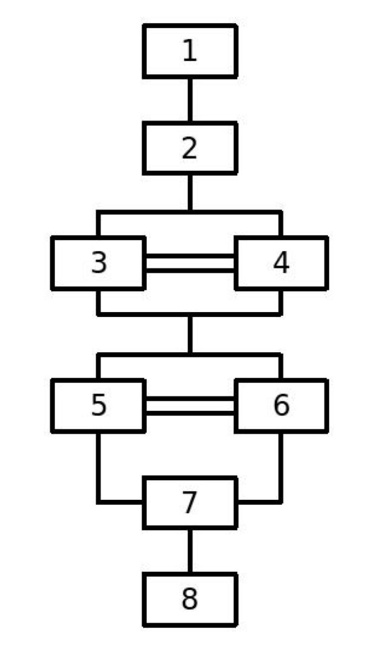 Figure 8a shows a simple stratigraphy. The units of stratigraphy are numbered from newer to older and represented in the Harris matrix in Figure 9. Let us assume that we interpret this stratigraphy as the remains of a house: a brick wall (7) with its foundation trench (8) that was filled with material (5/6); the floors of the rooms to the left and right of the wall (3/4). Furthermore, we interpret unit 2 as the trace of the demolition of the wall. And unit 1 is a layer covering the remains.