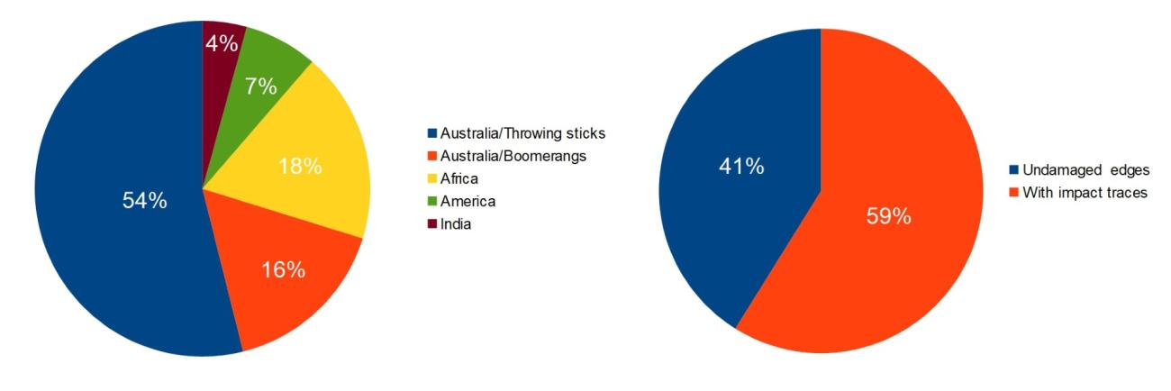 Throwing sticks as well as Australian boomerangs are present in the ethnographic collections of many museums around the world. Mostly collected in the 19th and 20th centuries by settlers and travelers, these objects were mainly studied by focusing on their particular shape, and observing their engraved or painted designs, to relate them to their region of origin. This cultural classification has been particularly useful in defining a regional typology for Australian objects (Davidson, 1936; Jones 1996). Indeed, the majority of objects of this type, kept in public collections comes from this continent, as evidenced for example by their proportion within the collection of the Museum of Quai Branly (See Figure 1, left). In addition, museum’s collections do not reflect the full diversity of throwing sticks. The choices of the collectors are the reflection of aesthetic preferences and I was able to observe among the studied corpus a more marked selection of certain categories of objects, for example the returning models (boomerangs).