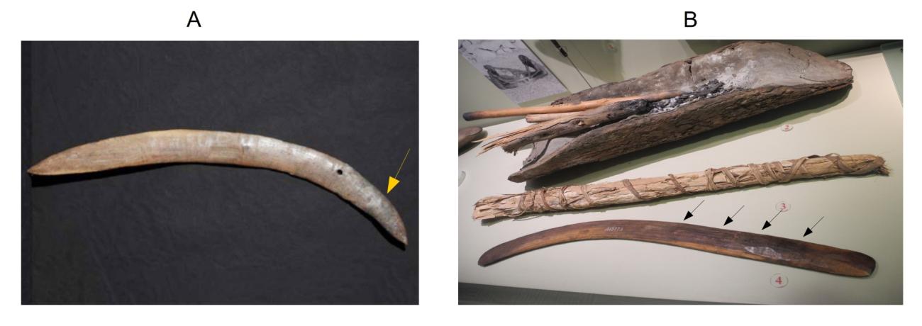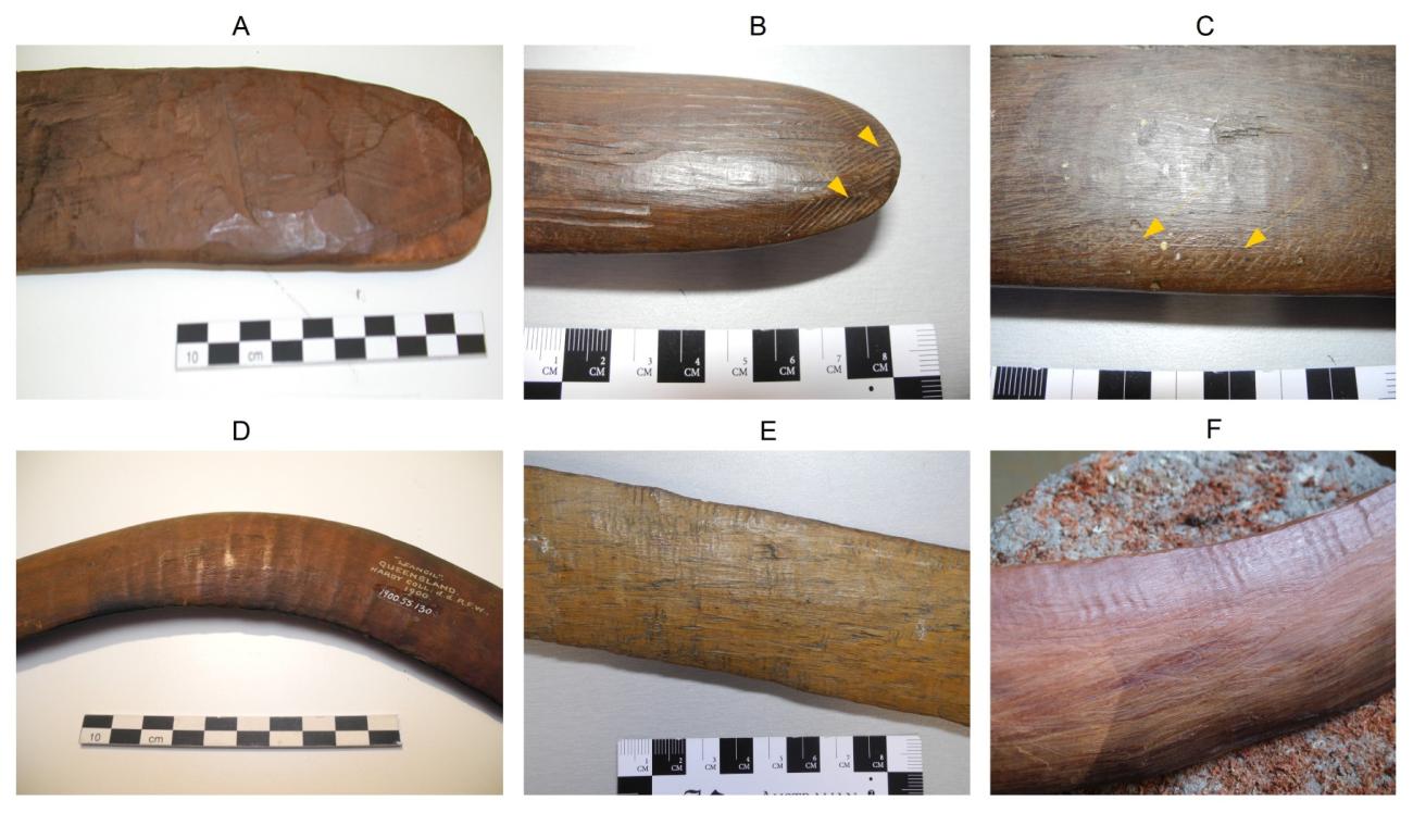 Traces of use are visible on some throwing sticks. The most obvious are the traces of use of fire, grip, and impact (Jones, 1996; Bordes, 2014).