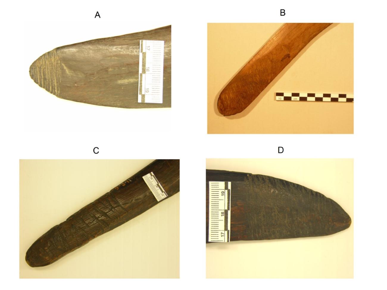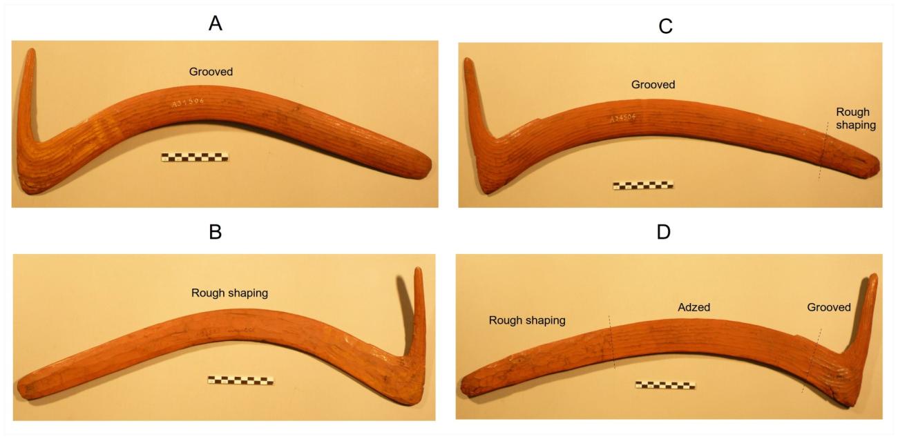 The recent absence of decorative grooving on the underside of the kylies and wirlkies from central Australia clearly shows that cutting tool shaping and then adze removal was a refinement step that preceded the regularization of the surface and the installation of the grooves (See Figure 4). Indeed, the oldest models, dating from the nineteenth century, have both sides regularized and fully grooved while more recent models do not have grooves on the lower surface (lower face) leaving the less visible surface only worked with an adze (See Figure 4a,b). Still others report an even greater shrinkage of the groove system which only partially covers the upper surface, omitting the gripping end (See Figure 4c,d). This change is probably guided by a progressive economy of this time consuming grooving work, but also a probable withdrawal from the ceremonial uses of this type of throwing stick, since these throwing sticks are used to be clapped together and their fluted surface used to produce sounds by rubbing a pair of them together during dances (McCarthy, 1961; Van der Leeden, 1967).