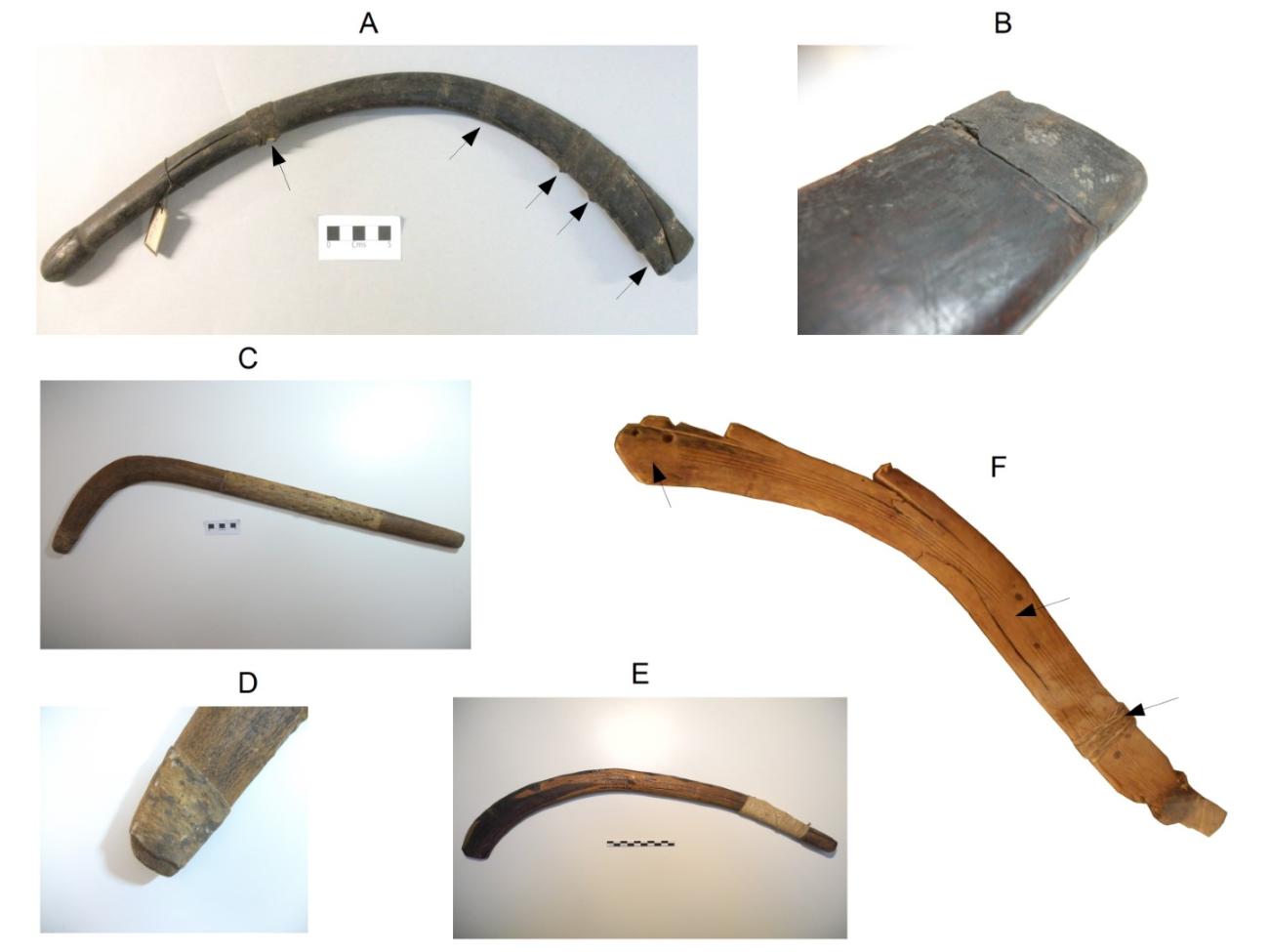 Installed as a preventive measure, the reinforcements are not totally traces resulting from the use of the object since reinforced throwing sticks may never have been used, but a few examples are presented here, since they ultimately play the same role as repairs and may look similar. The reinforcements can be made of different materials such as plant fibers braided in rope (See Figure 9e, f), skin sleeve (See Figure 9c, d) or even metal, in the form of fixed appliques (See Figure 9a, b).