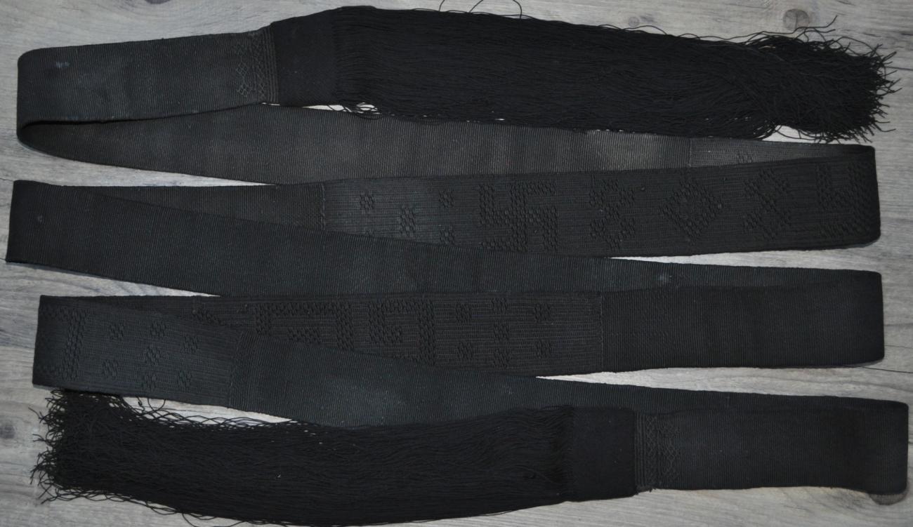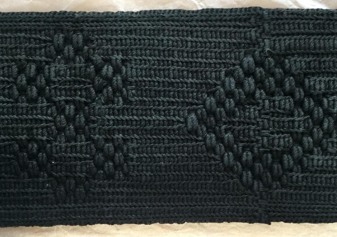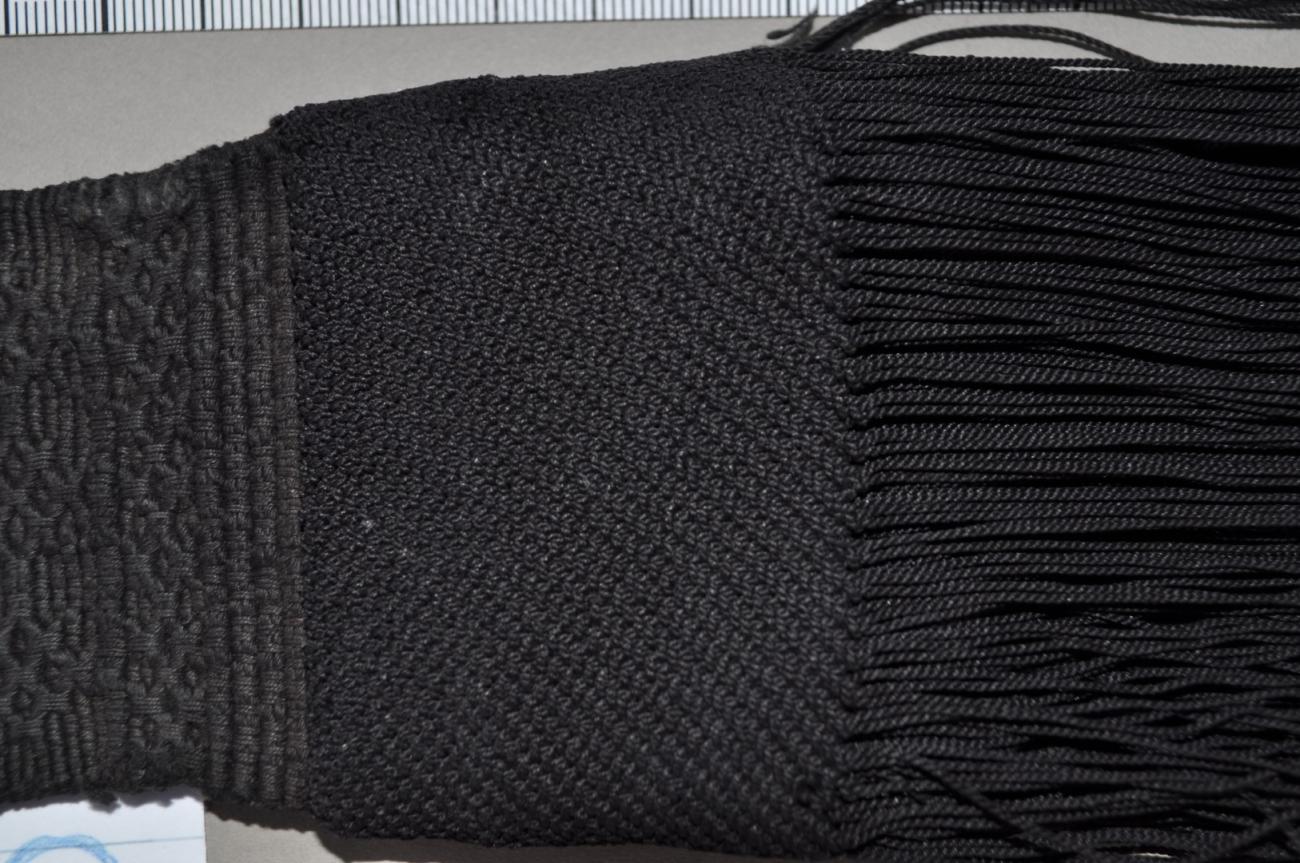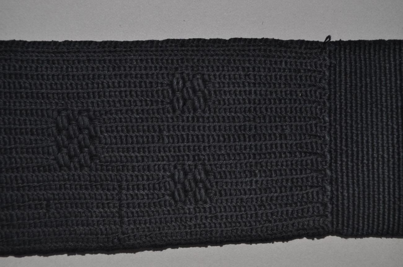 | Width: | The band is 6.5 cm wide in the tabby areas and 6.6 -7 cm wide in the twined patterned areas. It is just 6 cm wide where it disappears under the tassel. |
