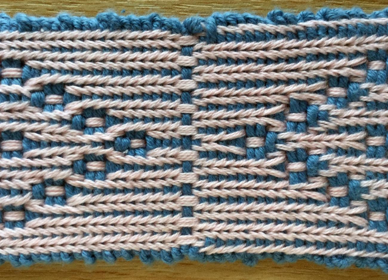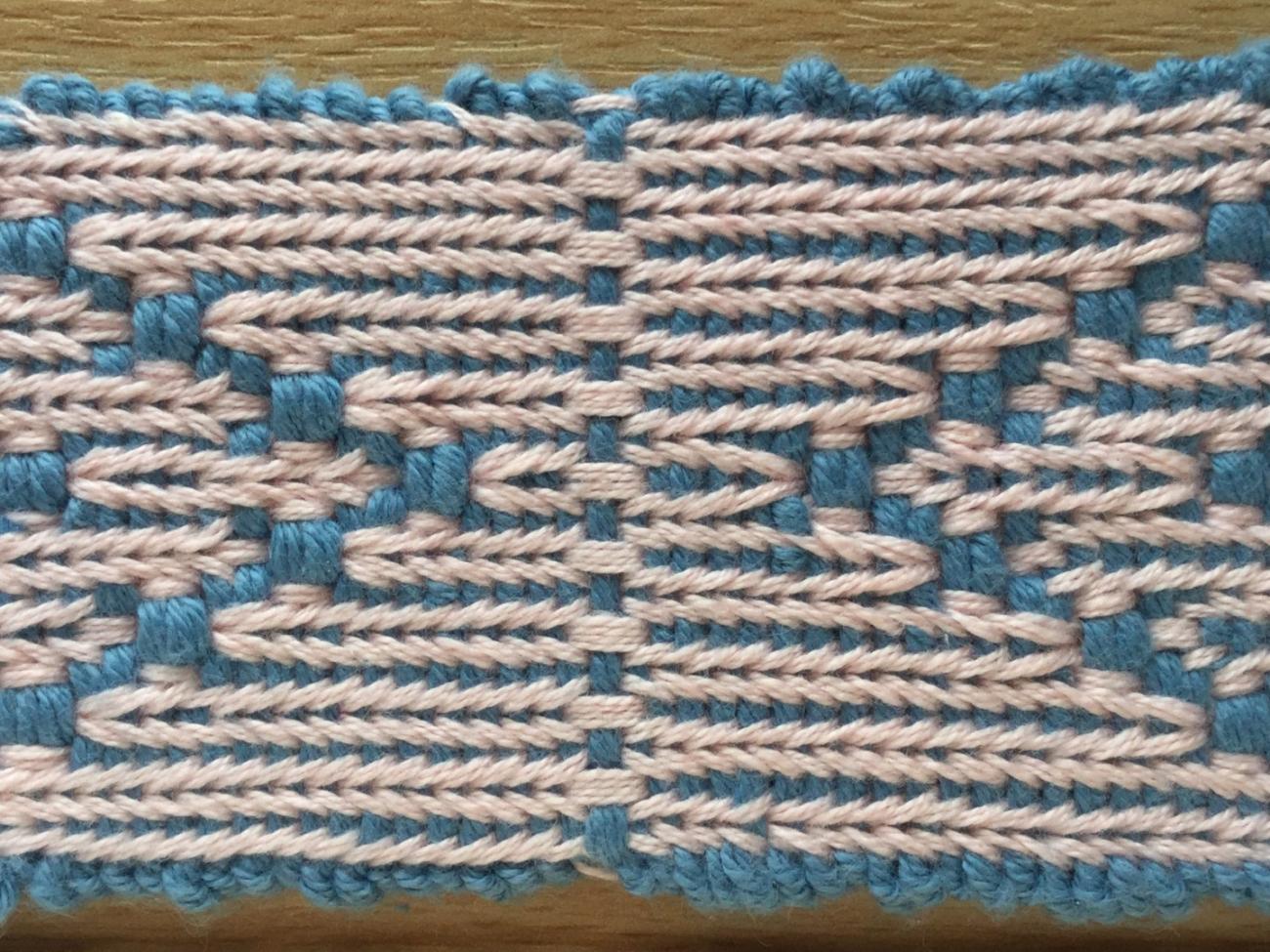 I wove my experimental samples using cotton warp and weft of different colours (pink and blue respectively) so that the motifs were readily visible against the background corded effect (See Figures 12 and 13). Therefore, a reversal point can perhaps be more clearly seen in Figure 12a, as can the change in the positions of the cords. On one side of the reversal (left), ten evenly spaced pairs form across the band. After the reversal (right) the cords form nine pairs, but with one additional single cord at each selvedge (there are 20 tablets in this experimental band). Exactly the opposite happens on the reverse face (See Figure 12b).