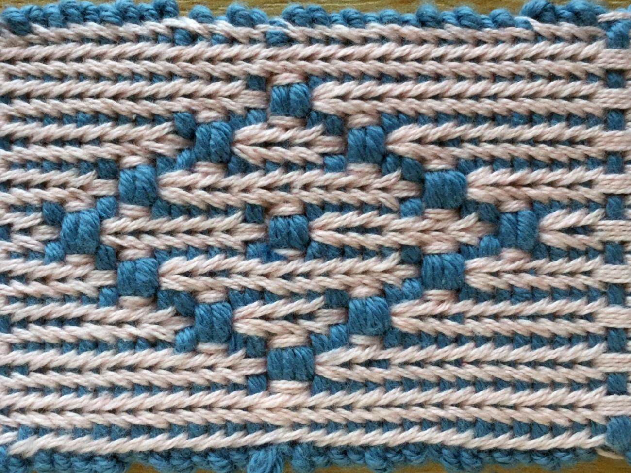 Figure 8 illustrates this process diagrammatically. The blue lines represent the warp threads; the orange circles represent the weft, which passes through the top shed, turns at the selvedge and returns through the bottom shed. The combination of a thick weft, and two passes of the weft in one move, creates a very sturdy band.