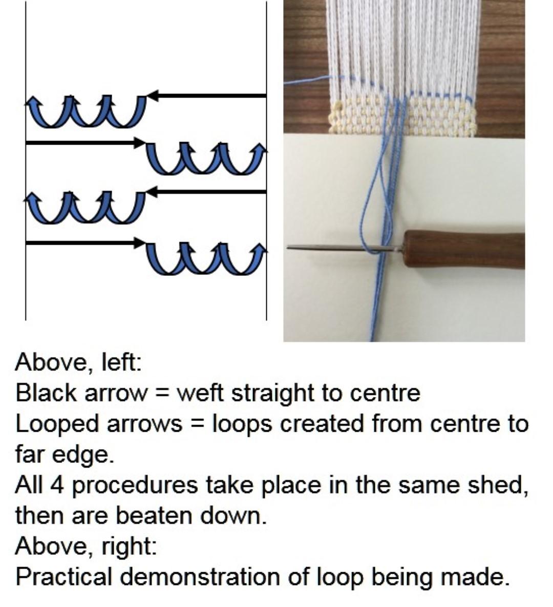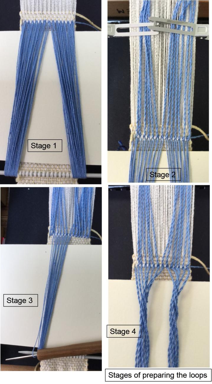 Dominique's photos are helpful here: Figure 5 shows some of the loops (greyish yarn) being held under tension on the right of the picture. Figure 4 shows how these loops are held under tension after being manipulated. Groups of loops are then temporarily secured together, so they do not interfere with the weaving process.