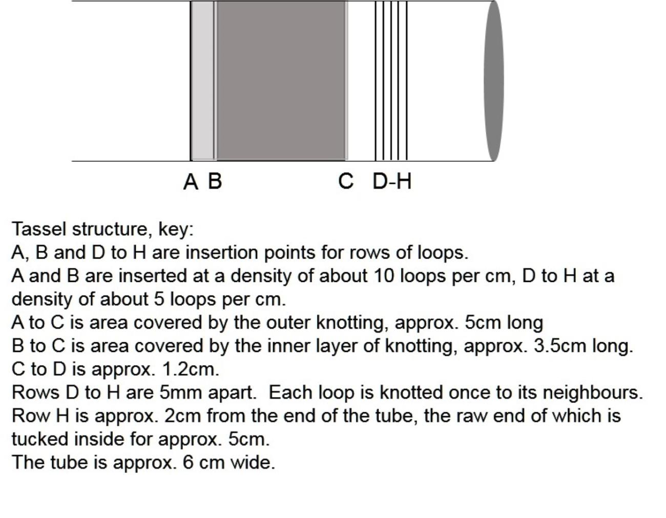 The loops in rows D to H of Figure 16 are simply knotted once to their adjacent neighbours, and the loops allowed to hang freely. Those loops in rows B are knotted until reaching point C (forming an inner layer), then the loops in row A are knotted to cover the inner layer, but remain separate from it (forming the outer layer) (See Figure 18).
