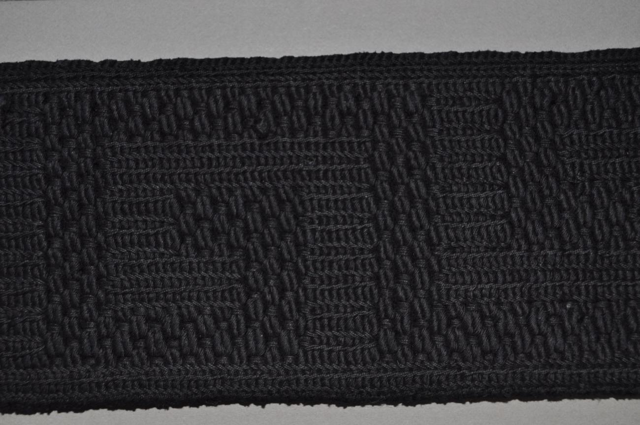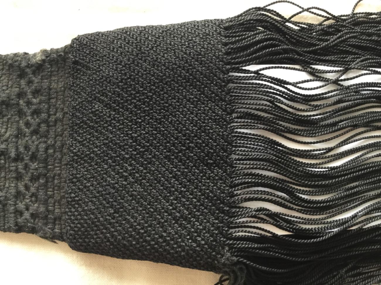 The difference in thickness between the warp and the weft gives the tabby areas a ribbed effect. Both warp and weft are black, although some areas have faded to a dark grey.