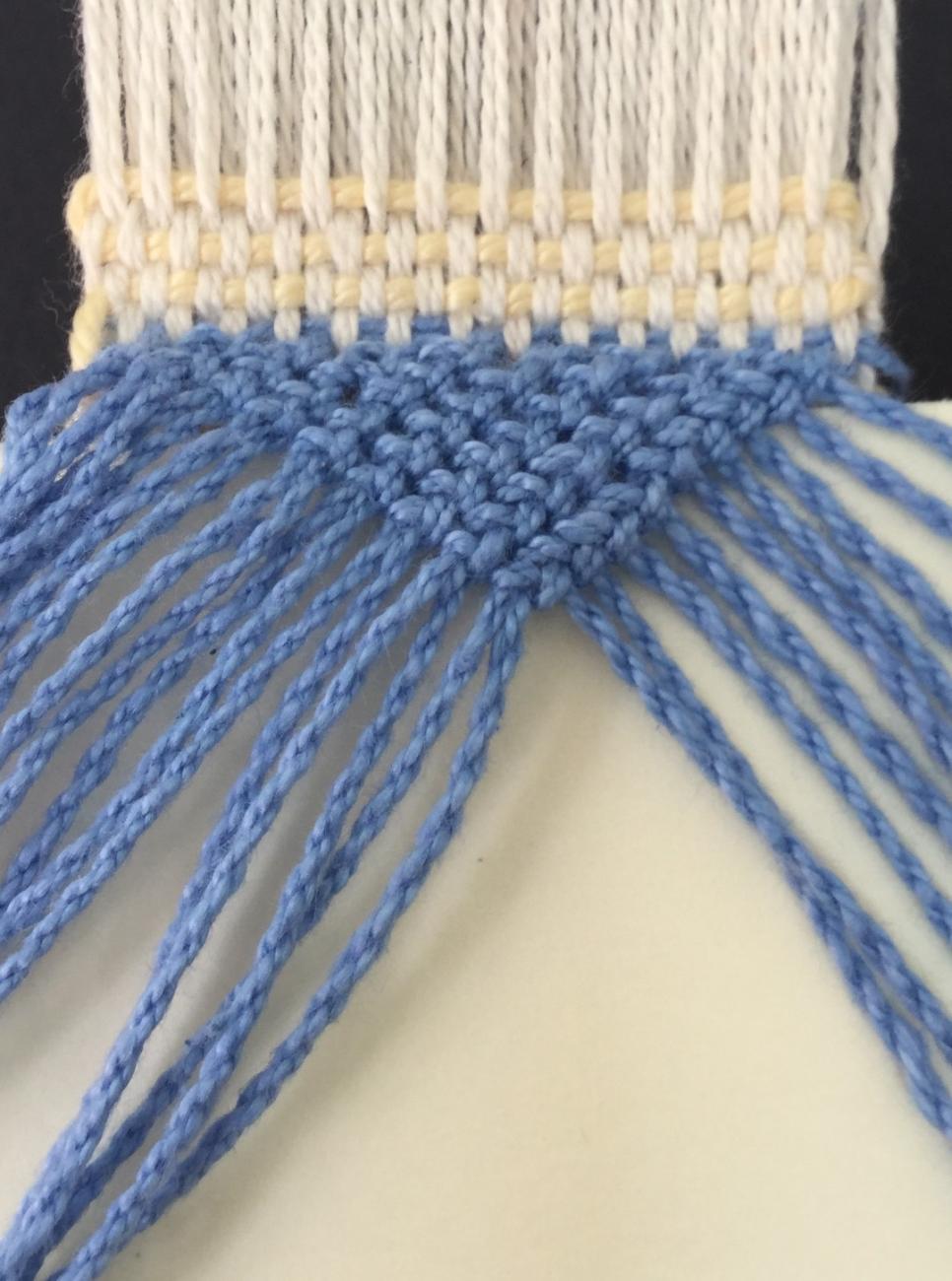 Once the weaving has been completed and taken off the loom, the loops are knotted together to form a decorative covering for the end of the band (See Figure 17).