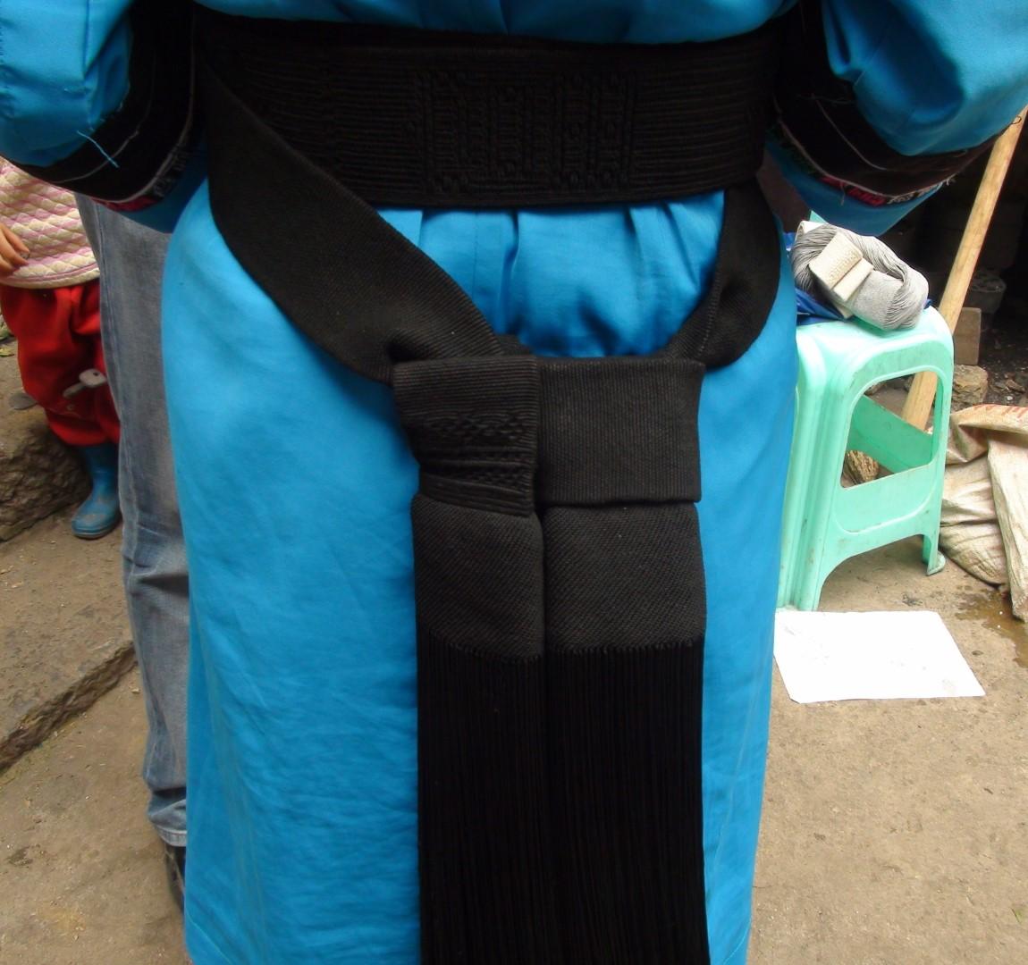 The remote mountain area of Guizhou in southwest China is ethnically diverse, and interesting textile traditions survive among the groups. Perhaps the best known are the multicoloured costumes of the Miao people that are skilfully decorated with embroidery and braids (Smith, 2007). Another ethnic group are the "Lao Han" (the ancient Han Chinese) who consider themselves unique from the rest of the majority Han population of China as a whole. They have lived in the Guizhou region since at least the 14th century CE when they were sent there as soldiers on military campaigns. Many stayed and took minority women as wives and formed separate communities. They are also known as the Chuanlan (Blue Dressed people) and are among the many ethnic groups in Guizhou province not officially recognised (Wikipedia, 2020; Joshua Project, 2020). Traditional costume has survived in the isolated Lao Han villages, especially amongst the women. Part of their costume includes a very long handwoven belt that incorporates two different weaving techniques on the same warp and is finished with a complex knotted tassel at each end. The belt begins and ends with a tube that is woven in a tabby weave, whereas the middle section has one or two textured areas that are achieved by using hexagonal weaving tablets in an unusual way.