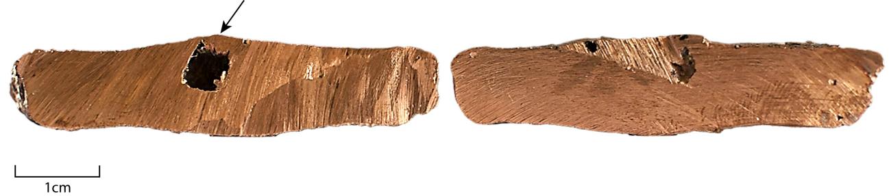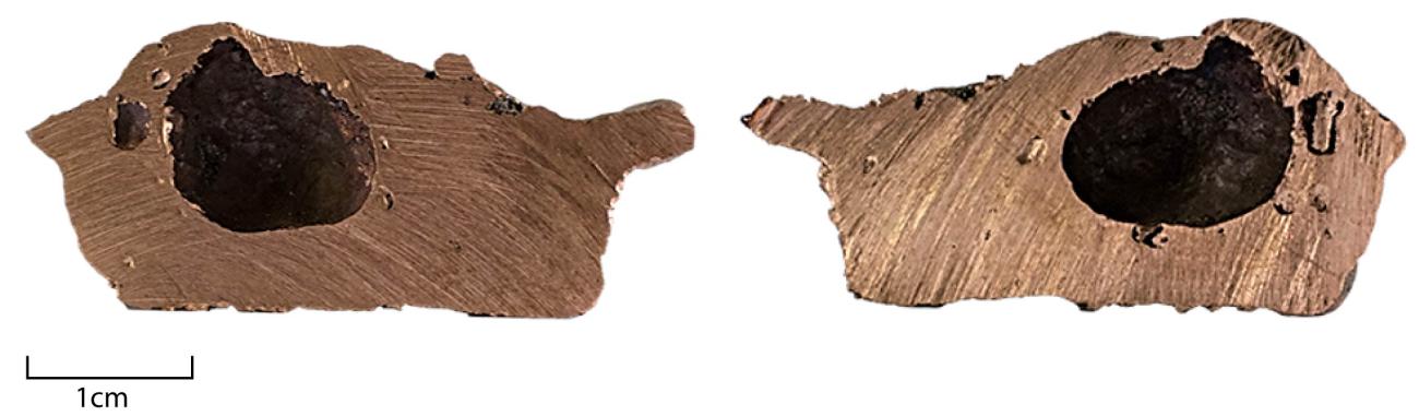 To further assess the defects within the core metal, the three axe-ingots were cut width-wise across some of the most pronounced surface imperfections. An electric cutting disc was used to do this. On EAI1, a first cut was made across the wide, but not tall, swell located below the central depression, about one third of the entire length toward the cutting edge. The only visible defect is a trapped bubble centrally located near the top. This bubble is 5.3mm across and 5.7 mm high (See Figure 10). Interestingly, this bubble actually burst the upper surface in a 2 mm wide perforation. This detail is only visible because light came through from both sides once the artefact was cut. Vacuoles were indeed noticed on the original Breton axe-ingots, and they appear as small burst bubbles on the surfaces. They do not look deep however, but this assessment may only be superficial as no light shines through them and some may actually be much deeper. A second cut was made at the top third of the piece, across the much-pronounced swell. The imperfections consist of an off-centre large bubble that did not burst through the top surface, and some smaller peripheral bubbles (See Figure 11). This large bubble is almost ovoid with a small hollow at the top. It is 16.9 mm long, 11.8 mm across and 10.4 mm high. The two largest bubbles studied on this axe-ingot (top third and bottom third), are in swells on each side of the large central depression, demonstrating that when the dip formed, excess gases were pushed within the core metal on its margins and got trapped.