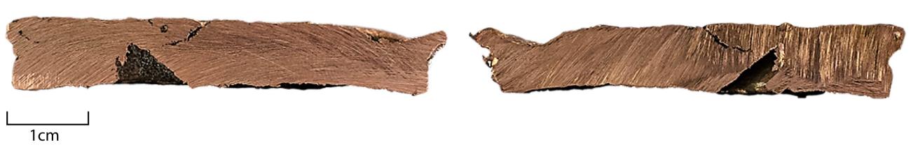 The combined results were not particularly conclusive in that porosity and major defects of the original axe-ingots were not replicated. Nevertheless, some degassing on the lower sides (in contact with the mould) was visible when using various mould types (mica-schist, hazel, green sand and delft clay) (See Figure 3 for sand moulds; see also Gandois et al., 2019, figure 14). Also, a large depression was noted on an example cast in hazel, that echoes a similar defect on the axe-ingot from Belz (Morbihan), but the rest of the molten metal did not fill the mould on this occasion (Gandois et al., 2019, figure 14.2a-b). In addition, the casting of an axe-ingot in oak caused ripples similar to those on the triangular axe-ingot from the Plouhinec hoard (Finistère) (ibid., figure 14.3a-b), as was discussed above in Papillon’s experiment.