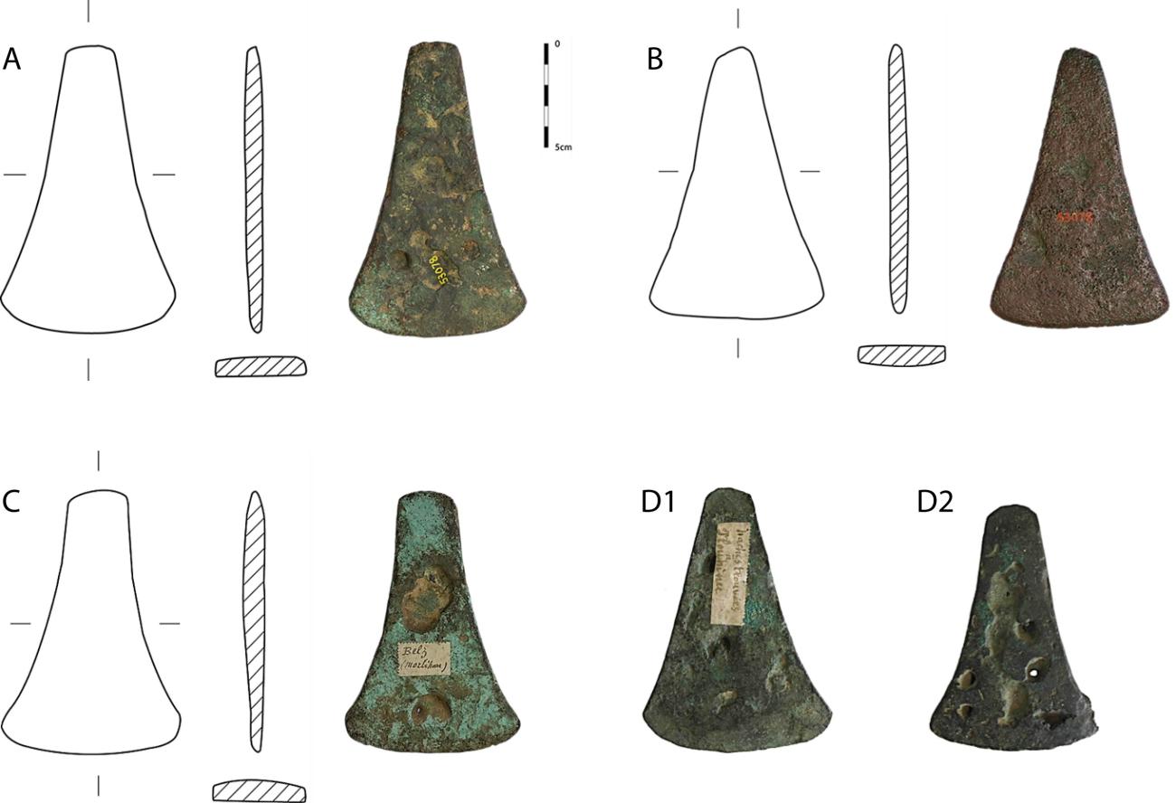 The artefacts are roughly shaped like flat axeheads, with a narrow butt, concave sides (sometimes asymmetrical), a broad cutting edge and a plano-convex section (See Figure 1). This particular shape is reminiscent of the axeheads of the Killaha phase. This phase situated at the beginning of the Early Bronze Age of Ireland, began sometime in the 22nd century BC and ended in 2000/1900 BC (See Figure 2) (O’Brien, 2004; Gandois et al., 2019; Burlot, 2019; see also Needham, 2017 for British contemporary axehead productions). This phase is characterised by the production of tin-bronze objects such as flat axeheads, daggers and halberds (Harbison, 1969a; 1969b; Burgess, 1974; 1979; O’Brien 2004; Burlot, 2019). It is worth mentioning, however, that the same types of object were already produced during the Irish Chalcolithic, which began circa 2500 BC (ibid.).