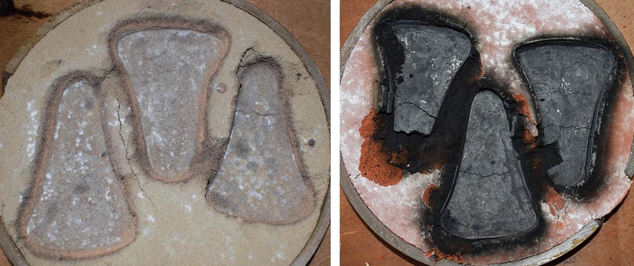Neither of the sands (green sand and delft clay) produced the desired result of porosity. However, the post-casting state of both types of sand is interesting. Once copper/copper alloy has been poured into green sand, the surface of the mould is not scorched since it does not contain any oily components. The surface is hardened but friable, and when crushed, with just the fingers, it reverts back into sand (See Figure 4). In turn, the oil-rich delft clay is scorched after the pour, and becomes much more resistant than the burnt green sand (See Figure 4). Such scorched remnants could potentially leave archaeological evidence on ancient metallurgy sites, but as was noted earlier, those remains are elusive.