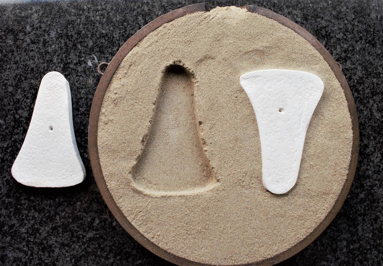 The green sand was originally mixed to the same consistency as the sand used during the previous (accidental) casting event. The green sand was compacted inside a steel ring 24 cm wide and 4 cm tall (Mould A) for two thirds of the height. The top third was filled with compact but slightly lose sand, then two clay templates were pushed down on this upper surface. Finally, the templates were removed to create imprints (See Figure 6). These imprints were sprayed twice with water (from a spray bottle) while the copper melted in order to keep the base moist but not saturated. A similar second set of moulds (Mould B) was created, but the plan for this double mould was to spray it multiple times while the metal melted. A third set of moulds (Mould C) was also made, using only wet play sand this time. No bentonite clay was used. The idea was to potentially recreate a makeshift mould with beach sand. The sand was mixed with water until an imprint could be pushed into it and hold the shape. This mould was covered with plastic film while the copper melted, to avoid loss of moisture and damage to the imprints. This experiment was not undertaken at the same time as the green sand experiments, but the melting and pouring conditions were identical.