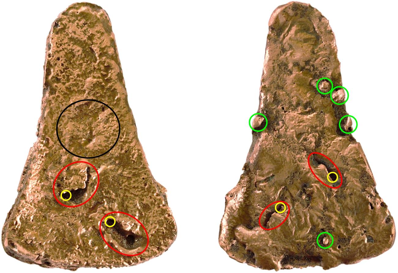 The axe-ingots recovered at Lough Gur are well-cast pieces, and except for some light surface pitting, they do not exhibit major casting defects (Gandois et al., 2019; Burlot, 2019). The same observation however, cannot be made for the axe-ingots from Brittany. The latter are porous, with substantial pitting. Some of the artefacts have complete perforations, as well as depressions, vacuoles and cracks (ibid.; see Figure 1). Some even have exhaust bubbles trapped in the metal core, as was demonstrated by X-radiography (ibid., figure 11). Post-cast work is very limited on the Ploukilla axe-ingots, except for light polishing on some surfaces, but hammering into shape or final polishing are not noticeable. Nevertheless, some of what would have been cutting edges have been hammered against the line, making those ends thick and squared (ibid.). This also supports the theory that the artefacts are indeed ingots rather than blanks. Blanks can be worked into shape (by forging for example) (Briard and Giot 1956). In order to become finished bronze artefacts, these objects have to be re-melted and alloyed with tin. Of course, during this process the distinctive Irish Killaha shape would have been lost. The intention to further process the metal may explain why these objects were so poorly cast (see Gandois et al., 2019; Burlot, 2019).