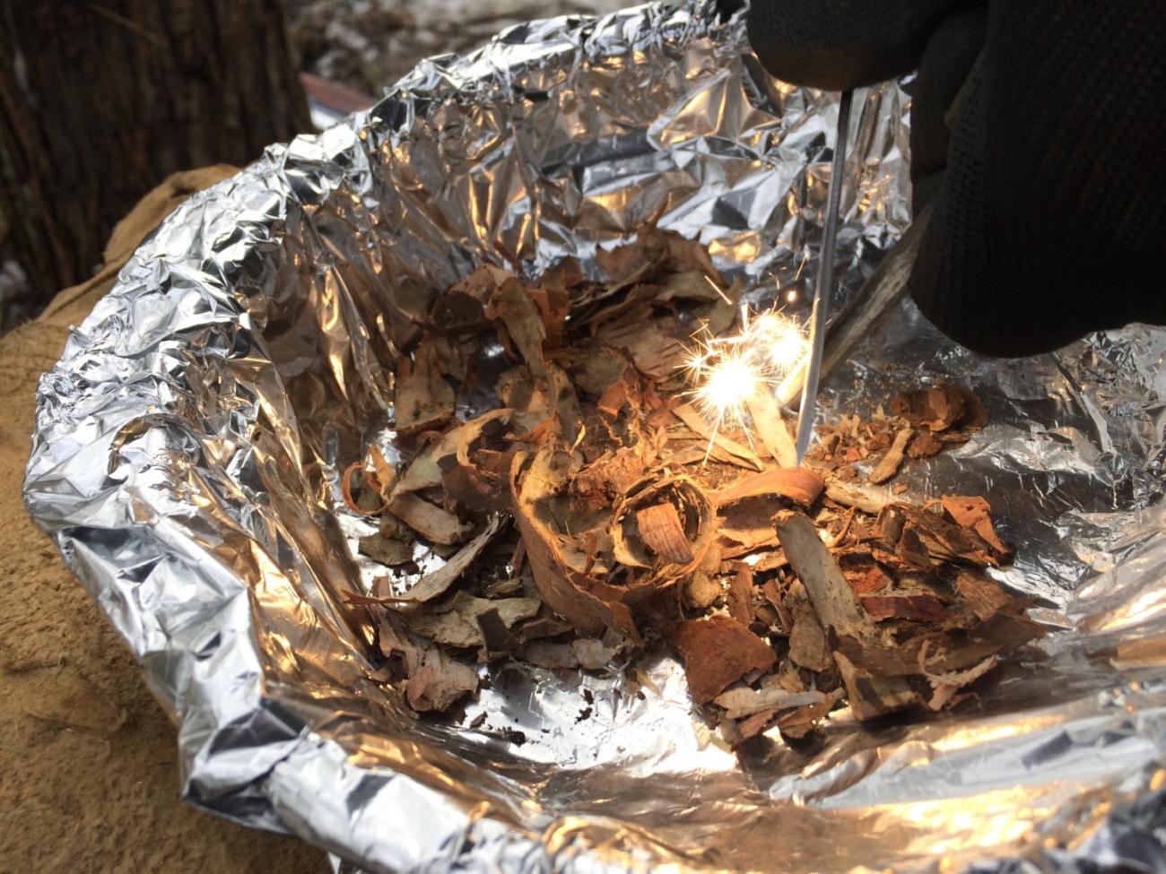 | Birch bark strips + ground | Lit match | Slow combustion |