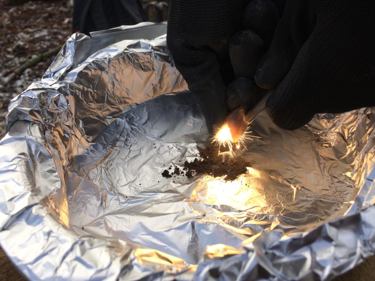 - The prepared tinder/MnO2 mixture receives the spark