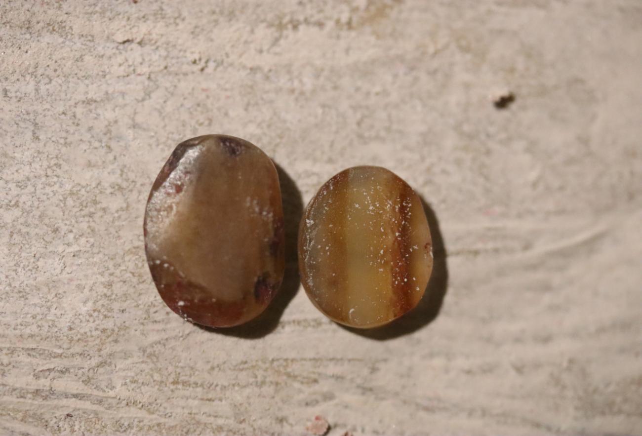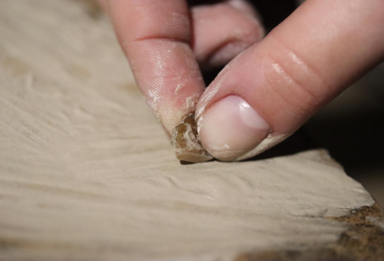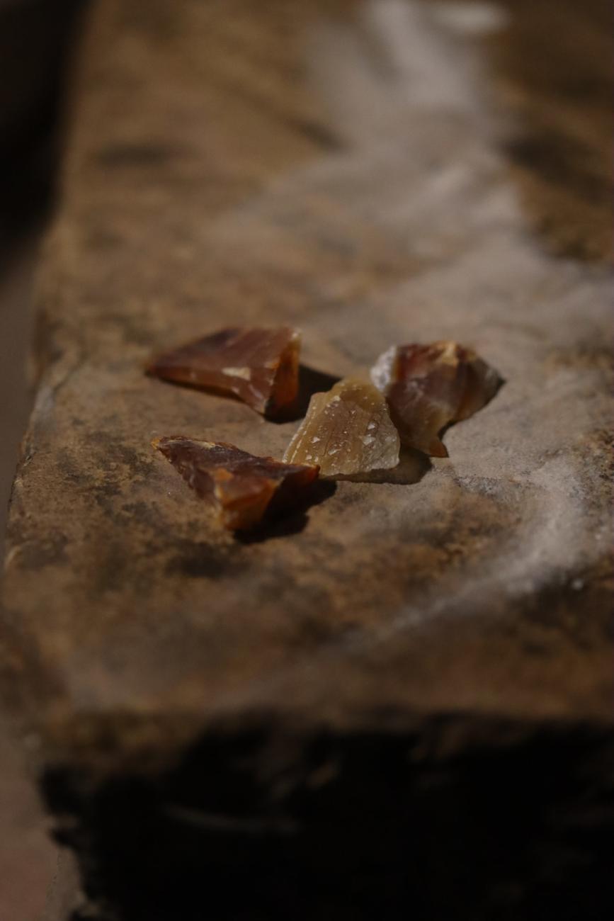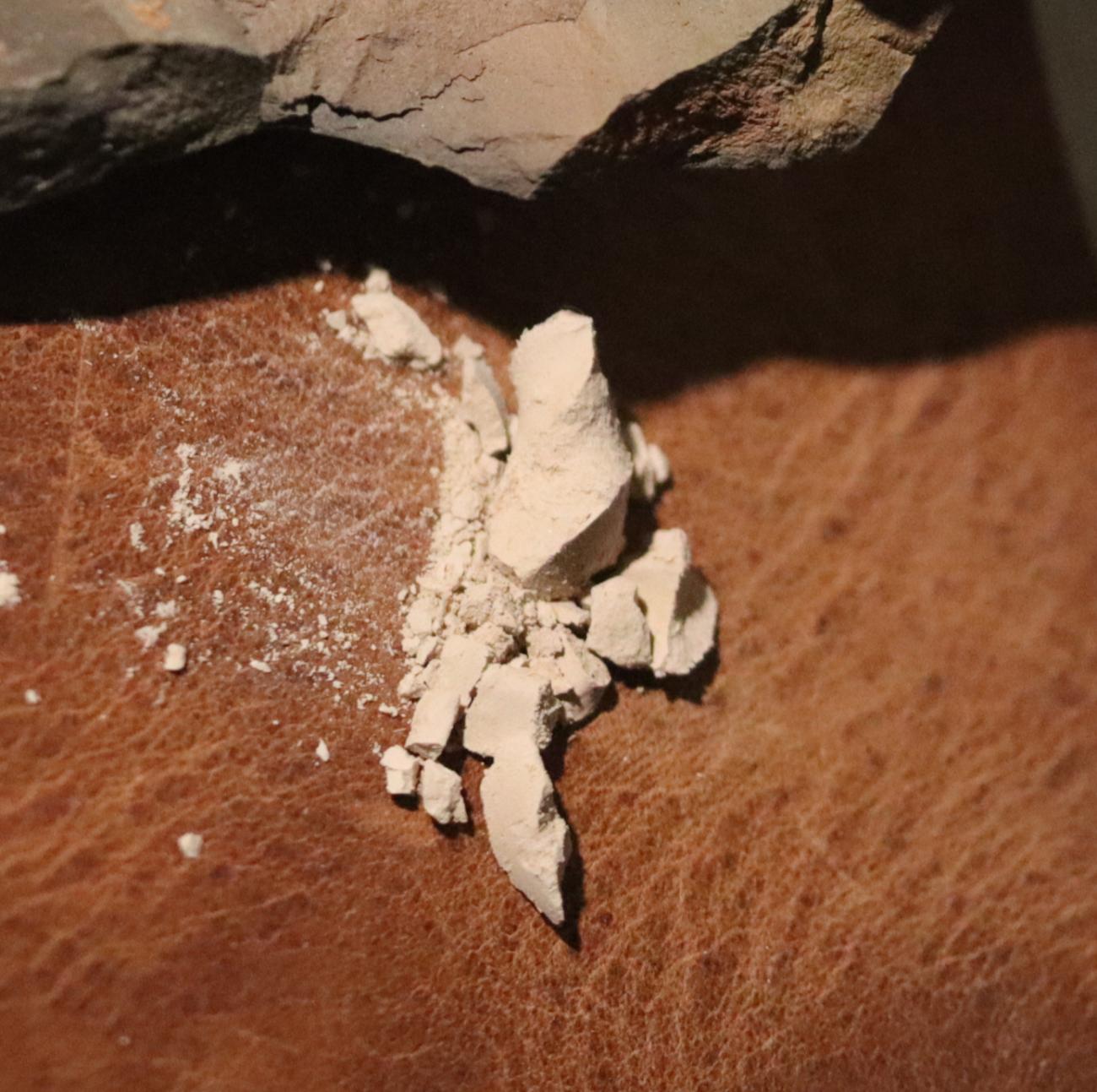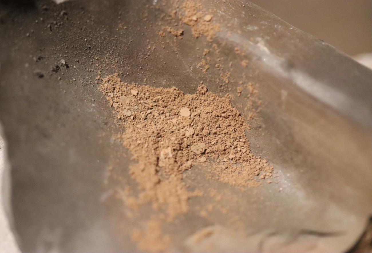 In the final stage of the experiment, the gem was polished using the waste material resulting from earlier grinding of the carnelian plate. In this process, material from both the mineral and the sandstone block was gradually scraped off to create a kind of abrasive paste. After drying into dust, a small amount was dissolved in water or saliva and then applied to a piece of leather or wood (See Figure 17) (Theophilus Presbyter, III, p.95; Osborne, 1912, p.276). The gem was rubbed against the prepared polishing material until a smooth surface was obtained. It was also possible to use a ceramic powder paste with the addition of small amounts of water (See Figure 18) (Theophilus Presbyter, III, p.95). The experiments showed the effectiveness of both methods (See Figure 19).