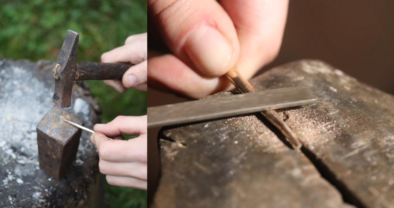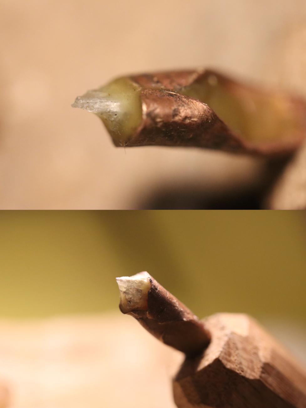 The next step of experiment involved the use of a sapphire nugget broken into small fragments (See Figure 10) of which two, with sharply pointed tips, were selected. The small size of the sapphire stylus made it impossible to hold it in the hands, thus necessitating the production of a handle with a socket for the stone. For this purpose, a piece of a bronze rod was given a fan-shaped at one. Copper alloy element was heated and cooled rapidly, allowing the metal to soften. After the stone holder had been hammered onto a wooden shaft, it was possible to bend the metal sheet (See Figure 11). Precisely mounted on the tool, the stylus was then fixed with melted wax (See Figure 12). Such a combination made future replacement of a damaged sapphire possible if need be. Interestingly, engraving tests performed afterwards proved this solution highly effective. The groove cut with the tool were high accuracy and allowed for continuity of lines (See Figure 13). The replaceable tip proved to be of vital importance when the sapphire point deteriorated. Repeated engraving activities resulted in slight but consistent wear of the tool finally hindering work, at which point, it required a repair. This stage of the experiment shows that it is possible to perform engraved ornamentation in the final stages of work, or during the processing of details.