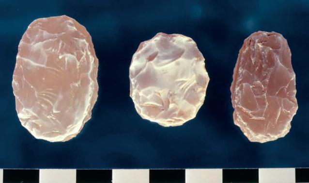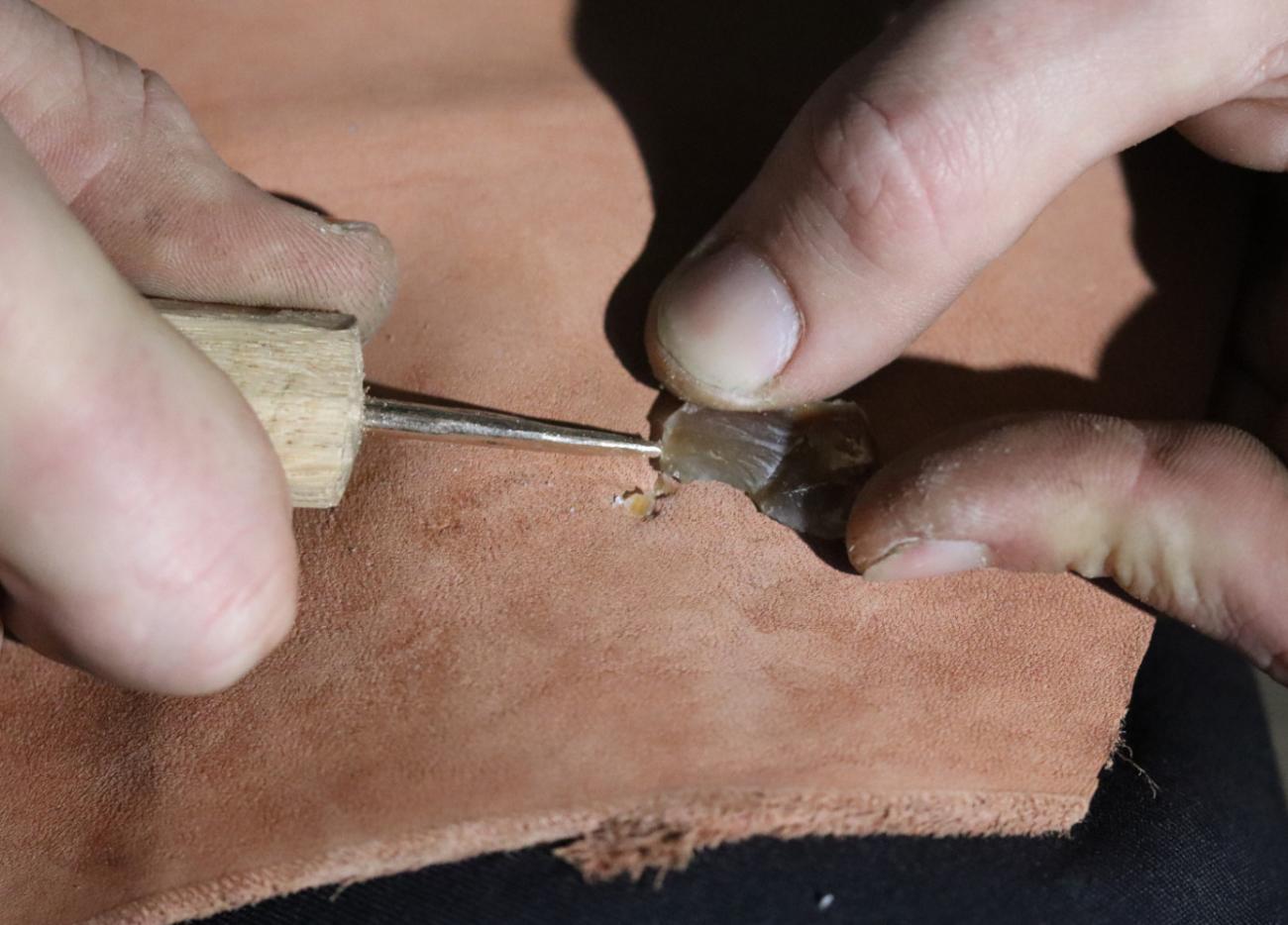 Research on the technology of carnelian engraving began with the preparation of a semi-finished product. Using direct percussion, a flake of the approximate thickness for the finished gem was produced (See Figure 3). The next stage of work called for a retoucher to chip off successive pieces of stone. This was made using materials and methods available in antiquity. The tool's bronze working pointed head was cold hammered for extra hardness and then ground with files (See Figure 4), the socket end was given a cross section similar to Roman tools (Jażdżewska and Sicieński, 2017, p.53). Then, using a knife, a wooden handle was carved, into which a round hole was burned to hold the metal element of the retoucher. When the square section of the tool was hammered into the handles round hole a durable and solid connection was produced. The finished retoucher was used to process the stone by splitting off small pieces to obtain a semi-finished product with a shape as close as possible to a flat, oval plate (See Figure 5). This stage of work is visible in unfinished engraved gems from 1st century BC found in the harbour cities of Muziris (India), Barnis (Egypt) or Aksum (Ethiopia) (See Figure 6) (Thoresen, 2015, pp.155-218; Francis, 2004, pp.447-604; Gupta et al., 2004, pp.9-33; Sidebotham, 2011, pp.236-238).
