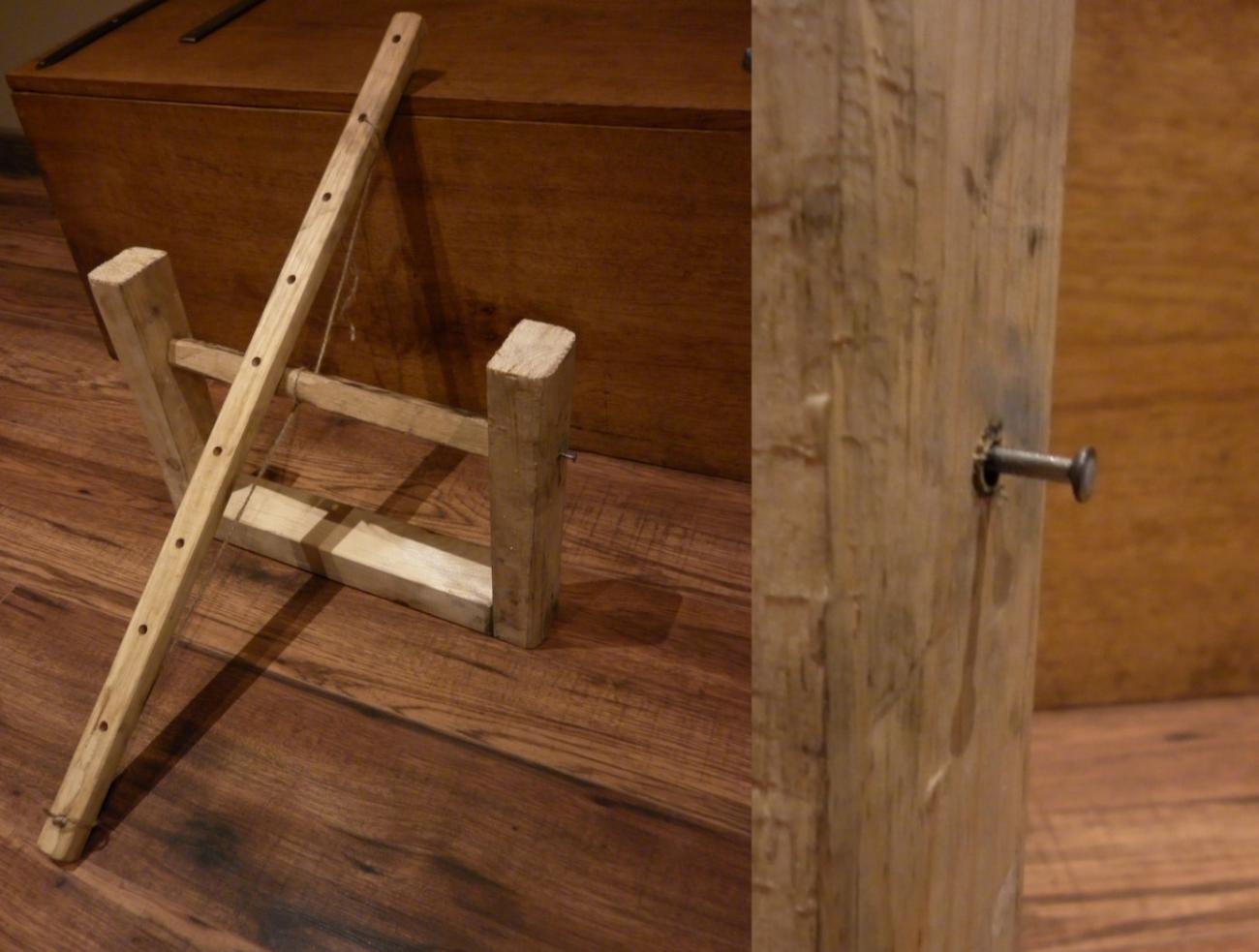 An alternative method of engraving required a simple grinder or a bow drill. Early tools of this type used to produce engraved gems date back to ancient Egypt more than two thousand years BC (See Figure 14) (Gray, 1983, p.192). The production of such a device involved the preparation of a metal working element, which was a carrier of "sharp sand" (Osborne, 1912, p.274; Gray, 1983, p.192). According to later sources, this sand may have been emery, i.e. fine-grained corundum, mentioned by Theophilus Presbyter in his work Diversum Artium Achedula (Theophilus Presbyter, III, p.95). This experiment required the reconstruction of an uncomplicated version of a grinding machine (See Figure 15). It comprised several pieces of wood forming a frame in which holes were drilled. Another element was a rotating, cylindrical piece of wood with a rod fixed on one side and a rod with a disc on the other. The device was completed by inserting the rotating element into the previously made holes in the frame. The bow worked as the driving mechanism (Rajan and Athiyaman, 2004, p.405). The craftsperson set the grinder in motion by wrapping a piece of string or thong on the rotating part of the machine. The metal disc with emery served as an efficient engraving element (Osborne, 1912, p.274; Gray, 1983, p.192). During the experiment, it took one hour to complete an ornament on the first stone (See Figure 16). A skilled craftsperson would be able to achieve the same result much faster, and proficiency in the craft would allow for far more precise and involved ornamentation.