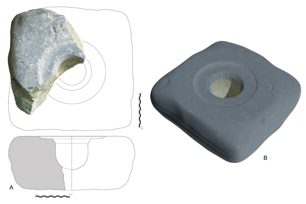 Within the group of potter's wheels recorded in the south of the Iberian Peninsula for the pre-Roman period, we have focused, as has already been mentioned, on the case of Gadir (the Bay of Cadiz). Based on the parallels discussed in previous sections, and in particular, the items dating to between the 5th and 3rd centuries BC, digital experimentation has been carried out using the only reference available at present, the base or "dormant part" documented at Gallineras (San Fernando, Cádiz). There, a fragment of a stone base that preserved little more than a quarter of the original piece was found, including part of the surface that was in contact with the wheel head and part of the socket for the stand of the wheel. Despite the poor state of preservation of the item, it has been possible to develop a digital model of the base by combining this with data collected in other contemporary locations such as Moura, Cancho Roano or La Mata, and with the information indirectly provided by the interpretation of the production process of the amphorae (see below).