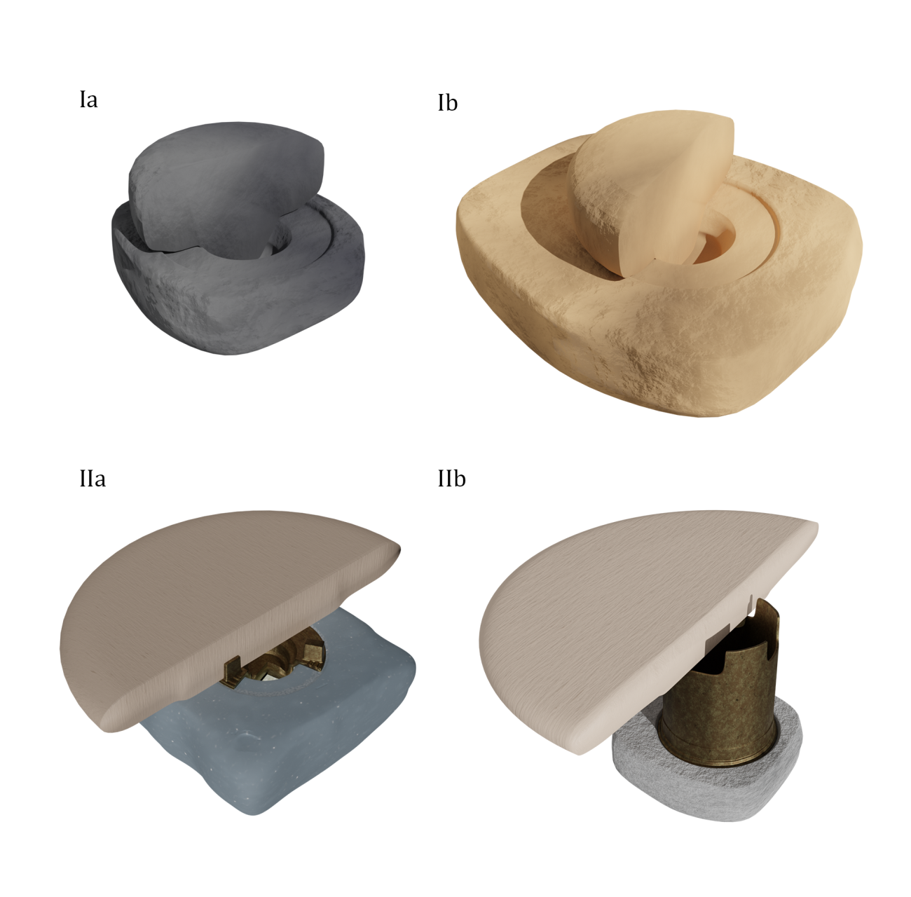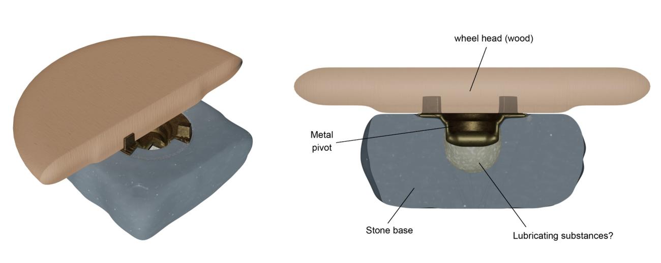 The result of the three-dimensional modelling of our hypothesis is a potter's wheel that consists of two dynamic parts (wheel head and metal pivot) and one passive base (stone socketed slab). The first two may be easily replaced in the event of breakage or severe mechanical stress and deterioration (See Figure 7). Regarding its eventual usage or operational mode, through this digital test we have observed some features that would be linked to making the rotation of the wheel-head work easier.