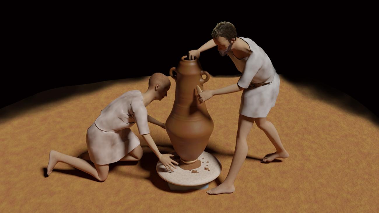 As we already pointed out in the introductory section, one of the priority objectives of the Ergasteria Project is specifically to take a step forward in the analysis of the operation sequence and the production methods on the basis of an experimental approach. Consequently, this specific research on the potter's wheels and amphorae has been developed with the aim of reproducing the process in the most historically accurate way. The final aim is, therefore, to produce replicas of the types of potter's wheels that we assume were probably used in Gadir's workshops during the 5th century BC and to turn on them more T-11213 amphorae, using when possible the local clays and 'recipes' that have already studied through archaeometric analyses. As a first step in the research process, this experiment has been carried out in digital mode, considering the available information on local wheels and amphorae and modelling 3D replicas to test the viability of the material experiments, the amount of raw materials required, etc.