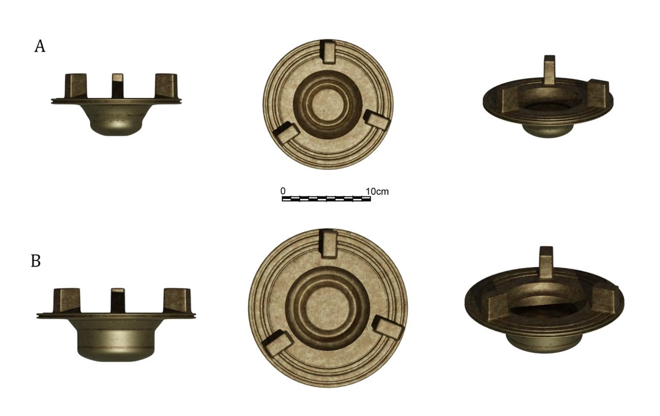 After developing the replica of the piece from Gallineras, the next step was to recreate the rest of the components that were part of the potter's wheel. In order to achieve this, we based our designs on the similarities observed with other potter's wheels documented in the Iberian Peninsula and the Levant, all of them classified within the two main typological groups already discussed, and on previous proposals for the recreation of the wheel heads (which both in the West and in the Levant used to be made of wood and therefore have not survived in the archaeological record). As described above, the first of the typological clusters includes potter's wheels that were formed by a stone "dormant" base that had a socket on which another stone pivot piece was fixed and rotated (Jiménez Ávila, 2013; Fernández Maroto, 2013). On the other hand, the second group of potter's wheels also included a stone base with a socket, but a metal piece was fitted to serve as a pivot for the wheel head, as was the case for the bronze items found in the province of Albacete (Meseguer and García, 1995), Las Cogotas (Cabré, 1930; Celestino, 1991, p.266, figure 3), Palomar de Oliete (Celestino, 1991, p.265, figure 2) or in Moura (Soares et al., 2013), and the much later ones documented at Baetulo (Serra Rafols, 1942).