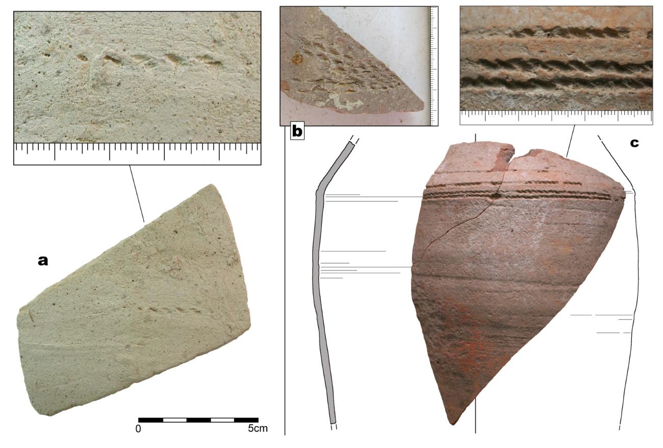 The drying process of the lower part of the amphora may have involved placing it on ceramic cylinders or supports at an advanced stage. These supports are frequently found in local workshops such as Camposoto and may also have been used to place the vessels inside the kilns to be fired. The lower cone, placed vertically with the open part facing upwards, would have ventilated and dried in a more homogeneous and rapid manner, although this would have caused the upper part to open and crack, making these pieces unusable. To avoid these situations, it must have been frequent to use ropes or strips of vegetal fibres to wrap the upper part of these cones to prevent them from opening while they did not have the appropriate consistency to continue with the production process of the amphora (See Figure 10.2). Traces of the use of these ropes have been documented, thanks to defects in the final smoothing and coating of some examples, both on T-11213 manufactured during the 5th century BC in workshops of the Bay of Cadiz (See Figure 14a) and on T-11210 containers of the same period and later T-12111 manufactured in workshops on the coast of Malaga (See Figure 14b-c). This suggests that it must have been a very frequent practice on a regional scale throughout the Punic period, at least until the 3rd – 2nd centuries BC