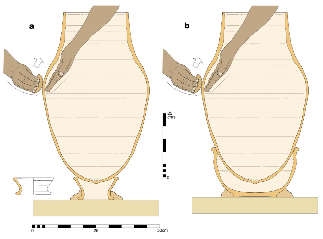 In any case, the process of joining the parts of the amphora would begin once the lower sections had a certain degree of consistency, while still being sufficiently wet to facilitate the fitting and to avoid causing any disturbances during the final drying process that would lead to dangerous cracks or fissures during firing. The lower parts would probably be placed on the wheel (See Figure 10.5), resting on bobbin-shaped stands (See Figure 15a) or perhaps using other popular vessels such as basins (lebrillos), whose greater diameter and depth (See Figure 15b) would provide more stability during the process of joining the parts. In any case, supports or basins would be centred and fixed on the wheel with clay, guaranteeing the stability of the vessel and the correct rotation on the axis. By turning upside down the pieces attached to the wooden discs, the central one would be placed on the lower section, on whose rim slurry clay would probably have been added and small incisions would have been made to increase adherence. The joints, however, appear to be predominantly lateral, as the diameter of the parts would not normally be identical. As the parts were still in a semi-wet state which could be resurfaced, with the help of hands or tools, the Punic potters would have turned over and made pressure on the junction area ensuring the cohesion of the area, eliminating the traces of ropes left by the previous process and finally shaping the transition between the two cones (the direction would inevitably have been upwards, probably causing a slight increase in the maximum diameter in the area and also in the length of the central part). Once this operation was completed, this area of the maximum diameter of the future amphora would be wrapped with ropes once again, leaving marks on the outside surface which are the ones that we have been able to identify among the available archaeological finds (See Figure 14).