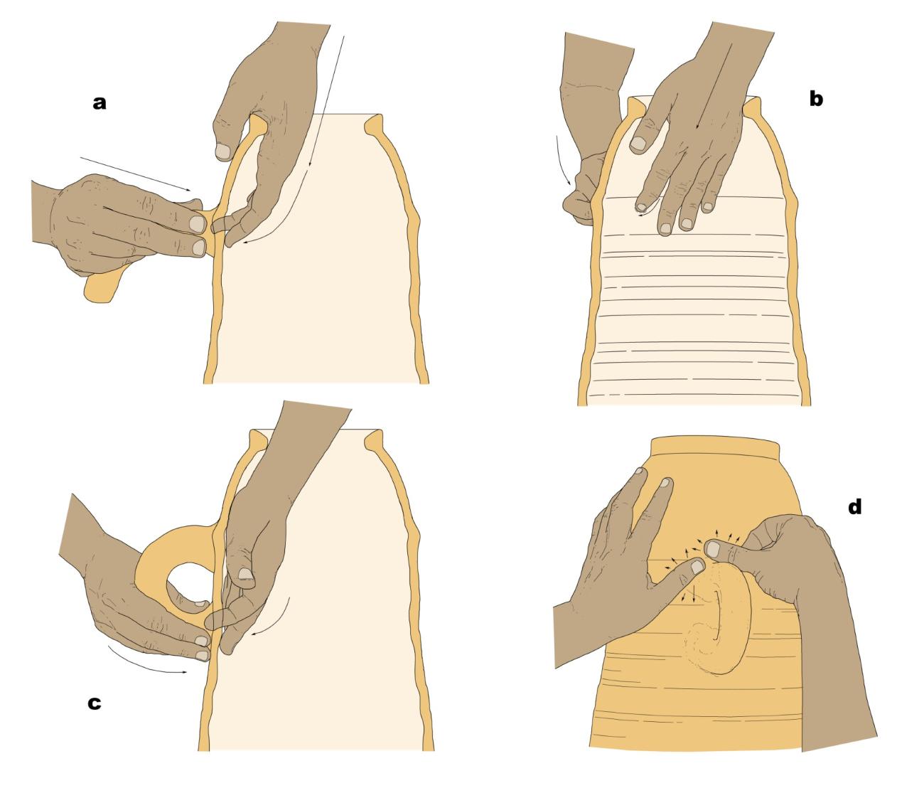 Probably before removing the strings tied together on the central section of the amphora, the handles would then be attached (See Figure 10.7). For this purpose, clay coils of around 15-20 cm in length and 3-4 cm in thickness would have been previously produced, perhaps systematically shaped by other subaltern craftsmen of the workshop (in fact, as it is a simpler operation, we cannot exclude that the placing of the handles was not carried out by the same master who produced the body sections). The fitting process would begin with the attachment of the upper part, which normally rests on the carinated wall which defined the transition between the back and the rim, by applying pressure from the outside on the wall of the container and also pressing from the inside to produce a fingerprint of variable depth (which could be made by placing all or part of the hand inside the amphora; Figure 17a-b). On the outer surface, as the available archaeological data suggest, no incisions or other previous preparation would have been made to improve the grip of the handle, at least in the majority of the cases (See Figure 18.1). The typical "ear-shaped" Punic handles would then be created by rounding off the coil, repeating the previous operation in order to attach the lower end to the body of the amphora (See Figure 17c). Finally, an external smoothing of the joints would be carried out, attempting to prevent air pockets and fissures which could threaten the integrity of the handles during drying and firing (See Figure 17d), making the upper area and the handles stronger for later use (perhaps related to the need to join the containers with ropes during sea transport to ensure the stability of the load). The numerous examples studied at Corinth (See Figure 18.2-7), Camposoto, or Villa Maruja - Janer allow noting that this was a systematic procedure, practiced in all the workshops active at the time in the Bay of Cadiz, with slight variations in the result (different depth of the fingerprints, absence of fingerprints in one of the two joints, etc.). The attachment of the handles could have been performed on the wheel, although it was not required, so it was probably conducted once the containers (and their supports) were placed and aligned in the area intended for drying prior to firing.