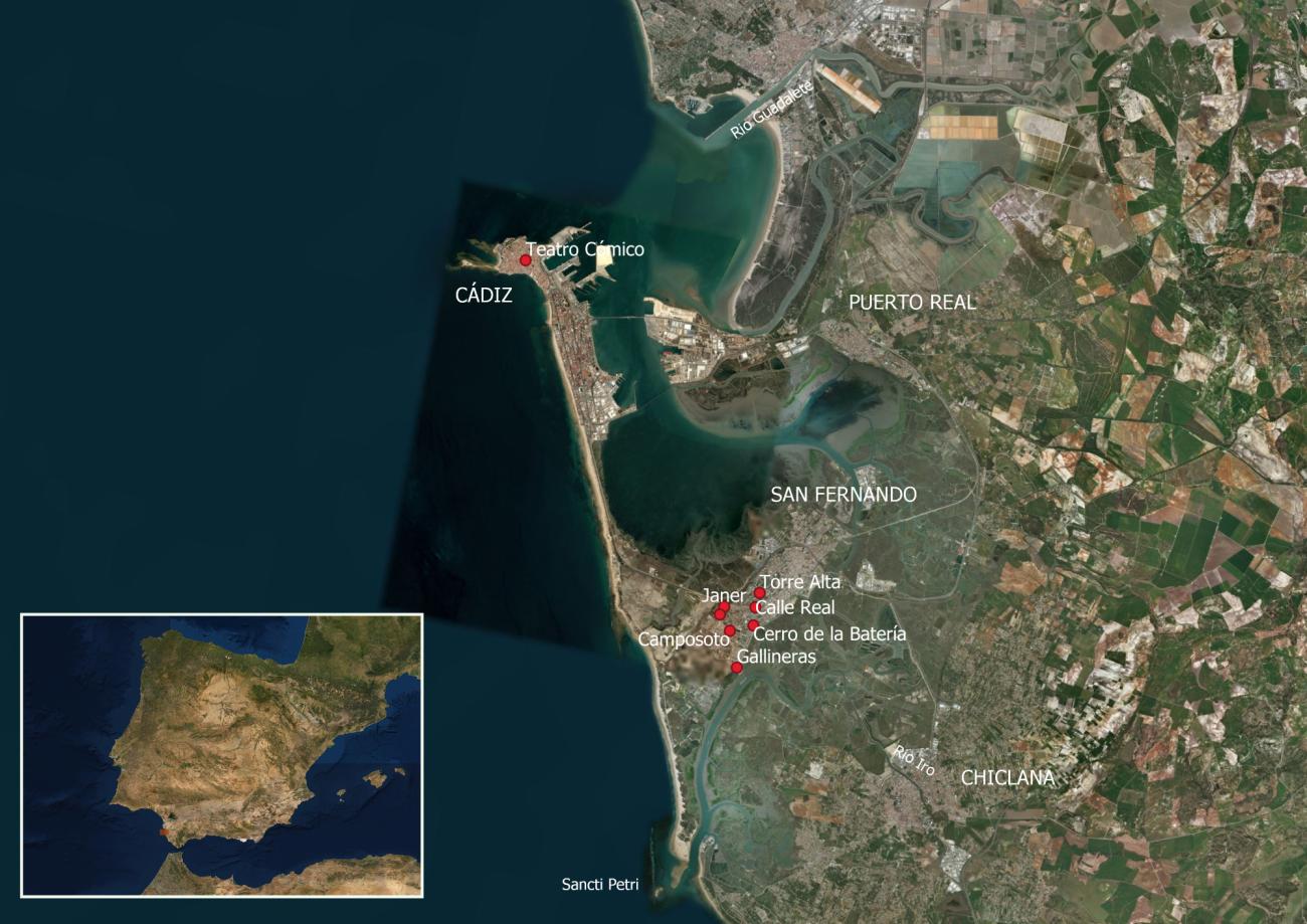 Fig 2. Map of the bay of Cadiz showing the main places and sites mentioned in the text (map by R. Belizón. Image source: ESRI Satellite https://server.arcgisonline.com/ArcGIS/rest/services/World_Imagery/MapS…{z}/{y}/{x}) Maps created using QGIS 3.16. Geographic Information System. Open Source Geospatial Foundation Projec [https://qgis.org.]).