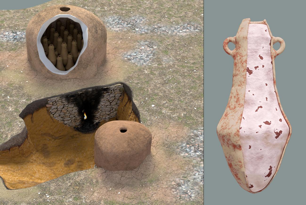During the 5th century BC, several dozen pottery workshops were active in the insular area of the Bay of Cadiz, exploiting the abundant clay sources available in the area and located not far from the fish salting facilities to which they supplied transport containers. The many excavations carried out in present-day San Fernando since the 1980s, and the research carried out over the last two decades have revealed the presence of many workshops that were active in the 5th century BC, each of which probably equipped with several kilns of different sizes. Recent quantitative theoretical approaches based on the development of 3D models of kilns and amphorae have concluded that the largest kilns (circular in shape, with a maximum diameter of around 3 m) would have been used mainly for the firing of amphorae of the T-11213 type, each of which could produce a maximum of 40-60 containers in a single firing (See Figure 3). Over several months and under favourable climatic conditions, each workshop could potentially have produced almost a thousand amphorae, in the case of being equipped with two large kilns and a corresponding capacity for wheel-throwing and processing the clays.