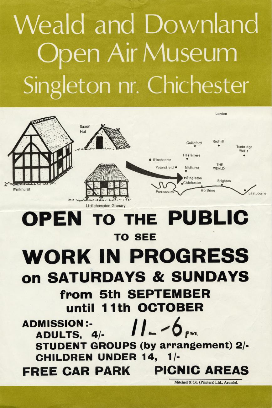 On the poster advertising the first opening weekends of the museum in 1970 (See Figure 2), the original Saxon building is featured as one of six exhibits (See Figure 3). It was described as a weaver’s hut, based on excavations at Old Erringham Farm, near Shoreham and at Bishopstone, near Seaford. Regular weaving demonstrations took place, and many years later these demonstrations are still remembered by returning visitors. There was also the outline of a third archaeological site, to create the footprint of a Saxon hall from Chalton, in East Hampshire. This was from a village deserted in the ninth century. It was often referred to as the ‘dragon’s teeth’ as there were only short upright timbers indicating the location of the post holes in a full-size layout of the building with the intention never to build the full structure. A museum archaeology committee existed to oversee the work and there were discussions about undertaking similar projects, but the museum’s primary focus remained on the substantial risk to the built heritage all around the museum. This was the main mission of the museum, as well as others founded in England at a similar time, such as Avoncroft Museum of Historic Buildings, Beamish and the Museum of East Anglian Life. The Weald & Downland Living Museum is close to the original site where Butser Ancient Farm was also being developed following the Council of British Archaeology initiative, and links between the two organisations existed. The museum’s original Saxon building sparked the imagination of many people, with a replica made in a school grounds at Pound Hill Middle School in 1972.