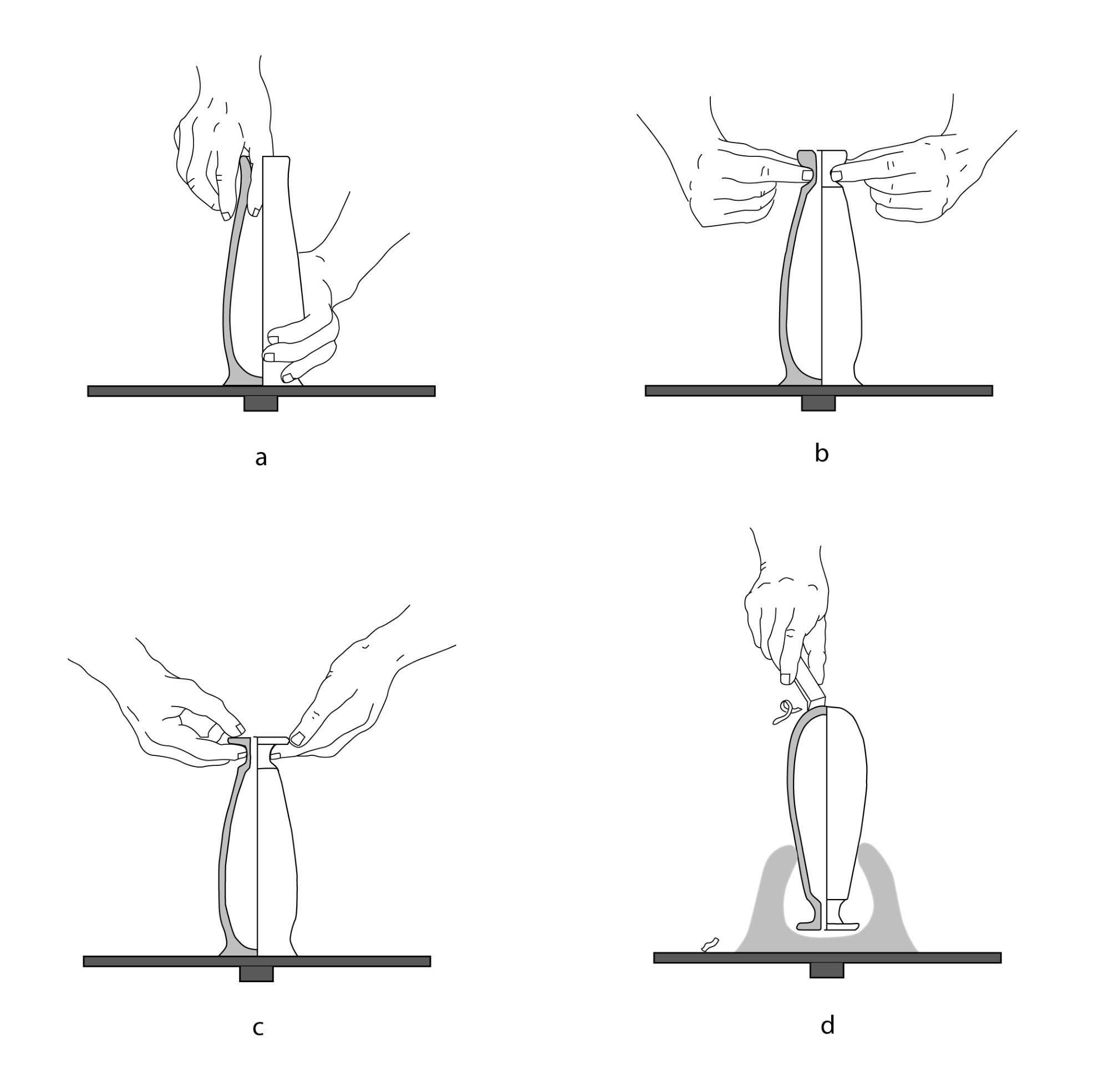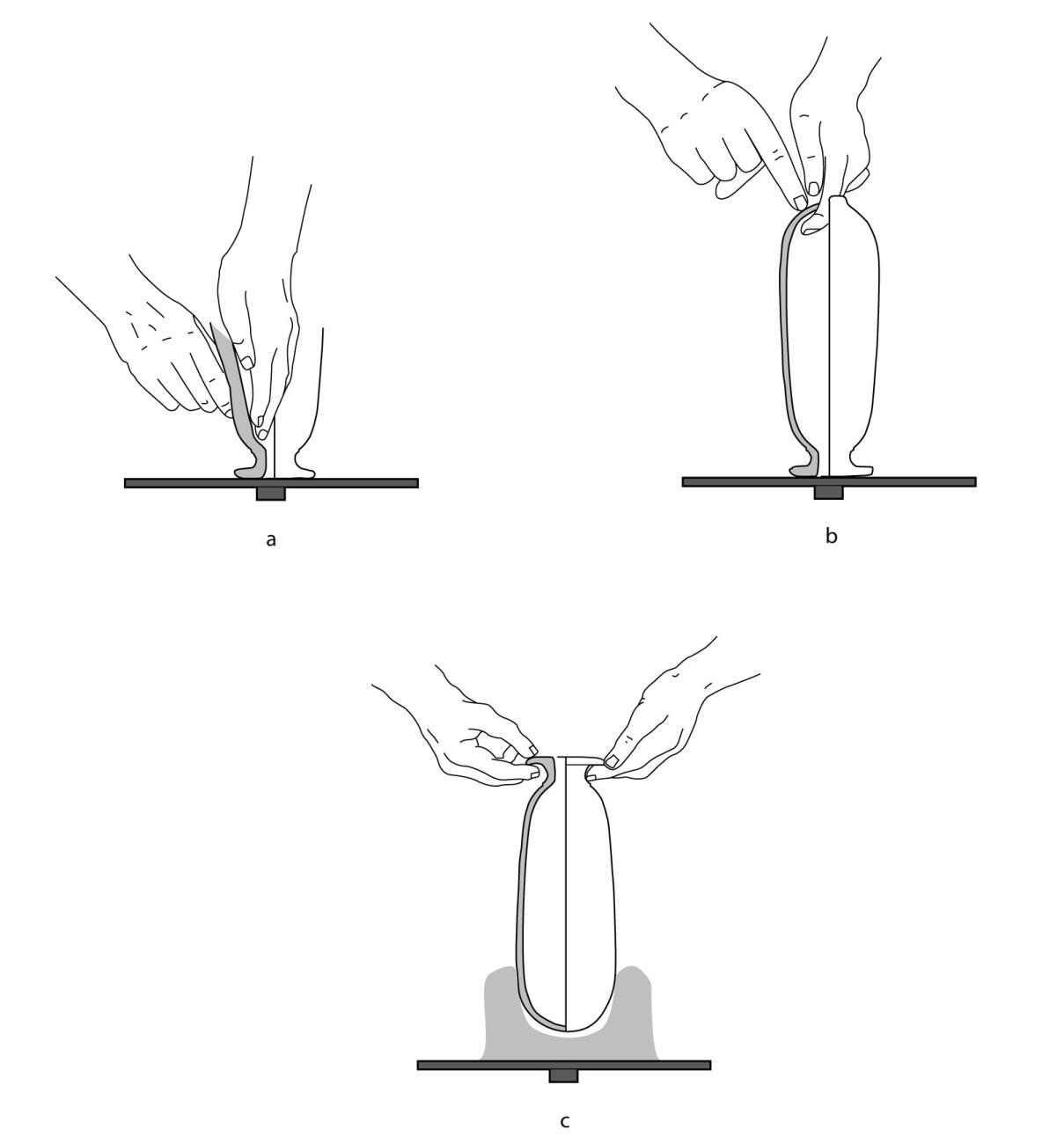 Although Schreiber specifies different forming techniques when analysing other shapes, essentially linked to morphological variants, he does not mention other possibilities in his survey of alabastra. Yet, the macroscopic observation of fragmentary vases indicates that, in some cases, the neck and the lip were separately shaped and then attached to the body of the vase. On an alabastron fragment in the Louvre, we can clearly see that the neck and rim were made separately: due to the extreme narrowness of the neck, the junction between the two pieces could not be worked from the inside (See Figure 4). In fact, given the lack of detailed studies and experimental research on the forming techniques of Athenian vases, one cannot rule out that the shaping technique of alabastra involved further variants. If Schreiber specifies that the vase was thrown from the base to the lip, it is also possible that the potters could have used another technique to make the body and the bottom of the vase. Indeed, ethnographic examples and even Schreiber’s reconstructions show that round-bottomed vases, like the dinos, were thrown from lip to bottom: the potter guided the clay inward, gradually closing the bottom, until it came together, a technique that might also have been used for alabastra (Schreiber, 1999, pp.99-103; See Figure 5a-c). This alternative technique, which I witnessed in the workshop of Mercedes Luińa in Tarragona in 2007, was likely used by the potter Paseas to throw alabastra, resulting in vases with a thin-walled bottom (Algrain, 2014, pp.49-52).