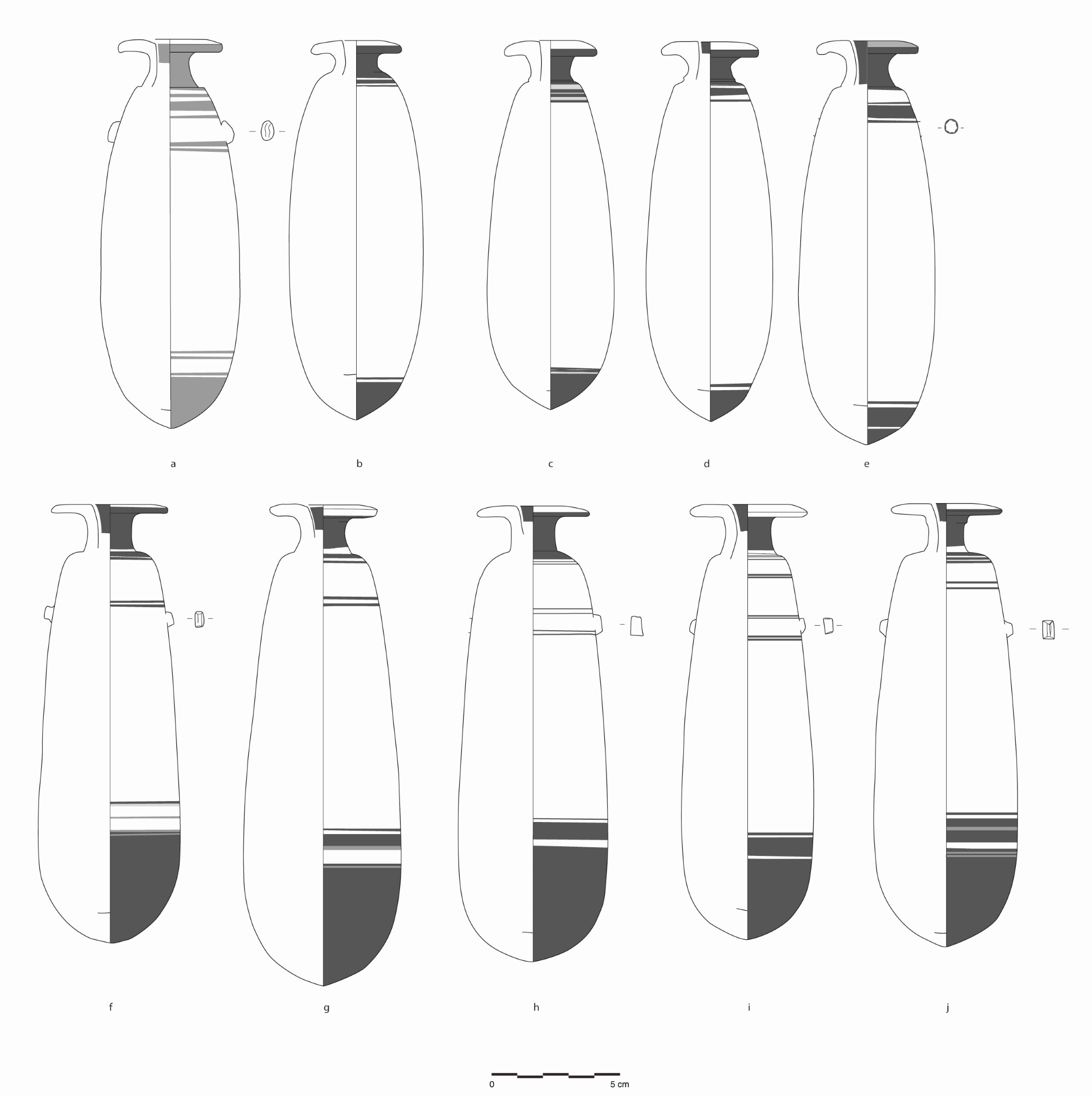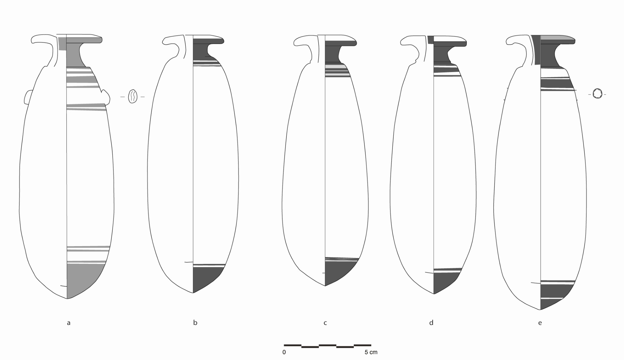 To simplify the grouping of vases (by painters or workshops), to compare morphological criteria and thus identify the result of the different techniques used by potters to produce a vessel, the serialization of profile drawings was used to organize Athenian alabastra (Algrain, 2014). This method has a long tradition in Athenian pottery studies and was first introduced by H. Bloesch for the morphological study of cups 80 years ago (Bloesch, 1940). Ideally, this method should be applied to a significant proportion of vases of the same shape. Serialization highlights the standardization of vases made by the same craftsperson or in the same workshop and helps us assess the work of potters. Morphological characteristics to be examined include general proportions of the body, vase height, width of the body and the lip, foot and lip profile, position and shape of handles/lugs, added elements, recurrent decorative schemes (Algrain and Tonglet, forthcoming).