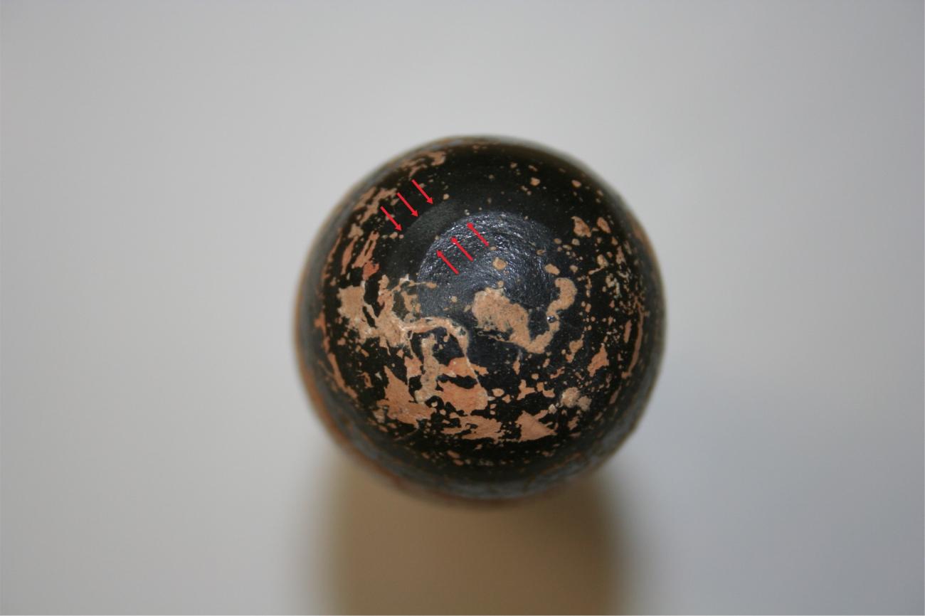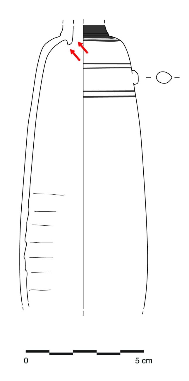 Other manufacturing techniques may help to determine vessels that are likely to have been produced by the same potter or by the same workshop. Such workshop traits are sometimes identified through added elements like lugs, the short and ornamental handles directly inspired from the lugs of Egyptian stone alabastra, though in Egypt lugs were often drilled, probably so that one could suspend the vase or attach a lid with a rope. The function of this element was lost, and it became a mere decorative element in Greek examples. Different types of lugs were made by Athenian potters and the techniques used to make these lugs are a huge help in identifying workshop traditions. For instance, in the case of Amasis, who made the first known Athenian alabastron, the lugs are shaped into half disks. The first alabastra made by Pasiades have lugs with a triangular section. As residual fingerprints were left on some of these, it is likely that the potter applied pressure with two fingers, probably the thumb and the index, to make the lug stick to the wall of the vessel. The attachment of the lugs to the body were extremely fragile, and they tended to fall off (See Figures 6a and b).