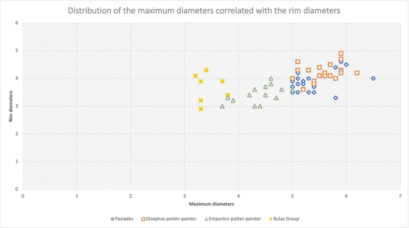 Let us take as an example four potters working in workshops who each produced a significant number of extant alabastra: Pasiades and the Diosphos potter-painter in the first quarter of the fifth century BC, the Emporion Painter in the second quarter of the fifth century BC, the Bulas Group at the end of the fifth - beginning of the fourth century BC. The scatter plot shows quite clearly low intra-individual variability in the dimensions of alabastra thrown by these four different potters who were identified based on macroscopic observation and profile serialization (See Figure 8). For these vases, the variability range tends to be around 1.5 cm, both for maximum diameters and rim diameters, except for the Emporion Painter for whom the variability range exceeds 2 cm when it comes to maximum diameters.