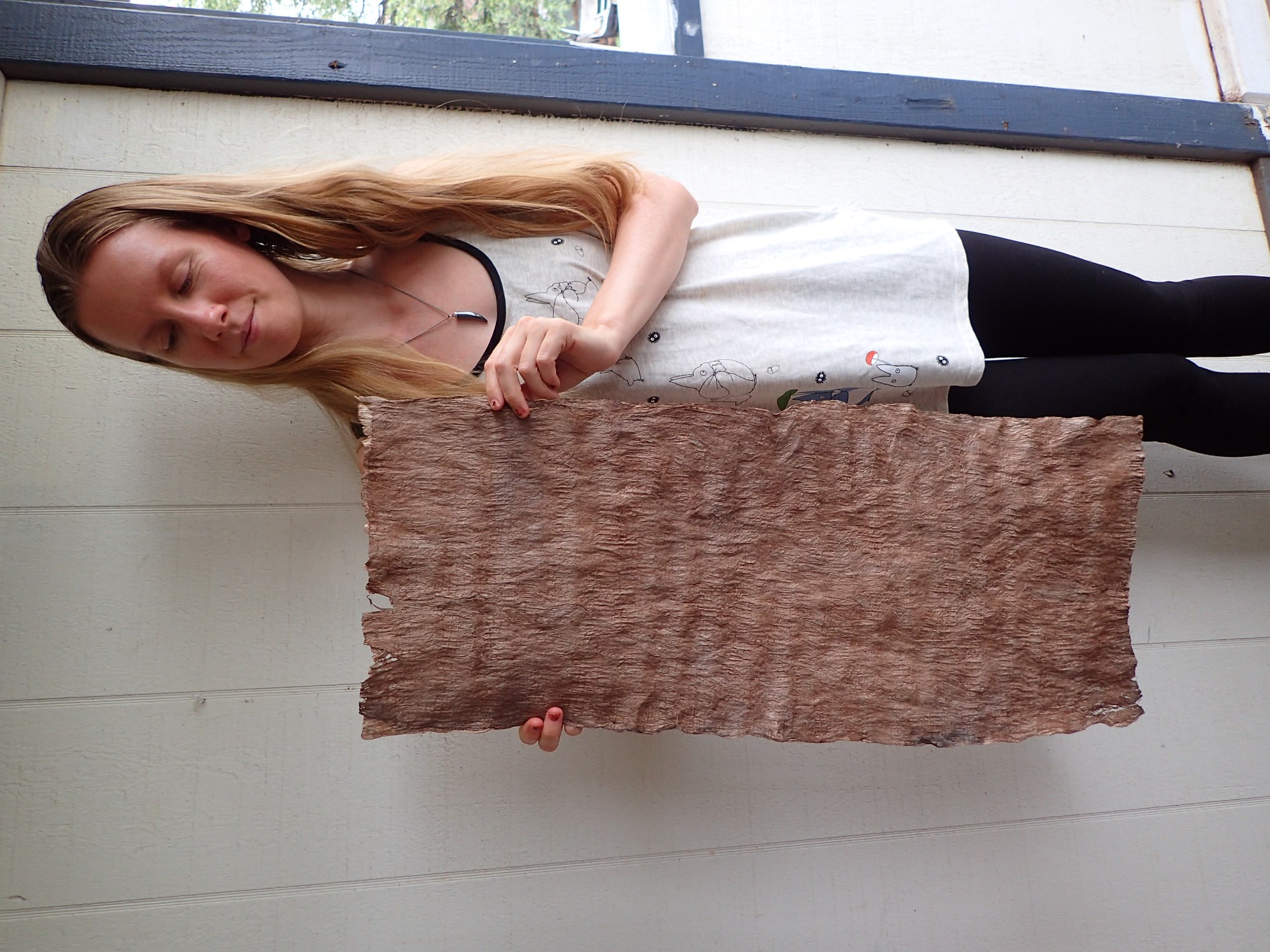 The first step of making a kapa kaha requires previously soaked wauke bast to be “daubed with hili” and allowed to dry (Kamakau, 1976, p.111). I was immediately struck by the fact that Kamakau does not mention the bast first being beaten into moʻomoʻo prior to dyeing. Modern-day kapa makers usually beat soaked bast prior to any dyeing activities. The act of beating the bast allows the fibers to spread, making them more receptive to colorant penetration. It is possible that Samuel Kamakau may have glossed over this initial step. Applying my knowledge to this situation, I chose to use moʻomoʻo (once-beaten bast, pre-kapa) for this stage.