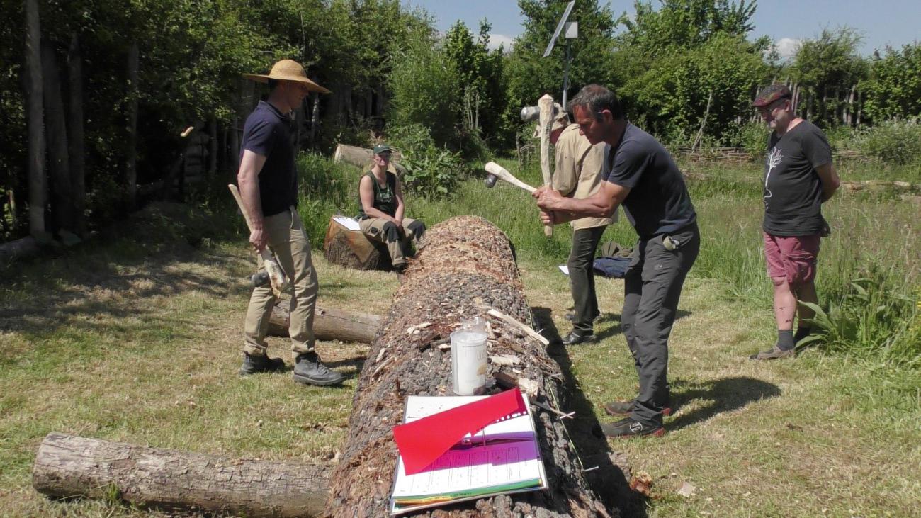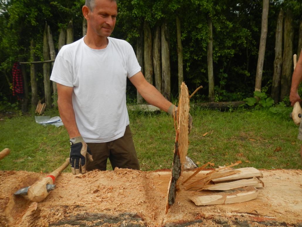 We made several polished fl int axes of the Buren type, which were documented microscopically before being used. Th is way we would be able to follow the development of the wear traces on such a newly made axe. As it is impossible to move such a big heavy trunk before it was turned into a canoe, we postulated that some people must have left the delta on an expedition of several weeks to find oak trees of this size and make the dugout at the site of the tree felling. Some of our questions are: