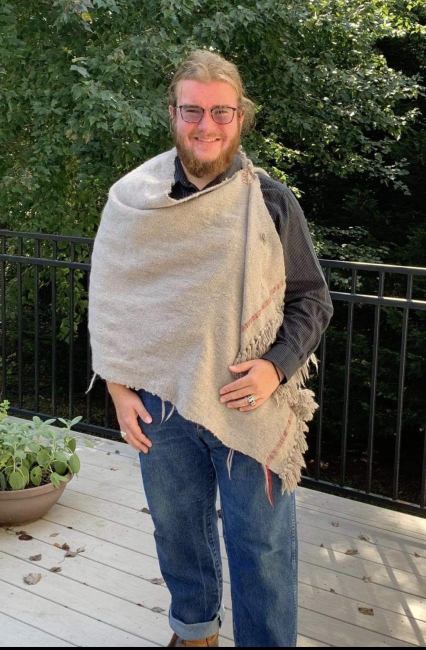 A Greek chlamys is a cloak that is primarily associated with travelers and hunters and was widespread throughout the Greek world (Canavan, 2015, pp.118-127). The chlamys was chosen because it is a basic shape, requires only basic skills, and was a commonly used textile. Like many Greek textiles, it is rectangular in shape, and it is fitted to ones body with various pins and fibulae (Harlow and Nosch 2014, p. 22). These factors provide a good understanding of daily textiles, and they will make this easily replicable by weavers possessing a variety of skills. The dimensions are approximations based on images on red and black-figure pottery from the late Archaic/early Classical period around the 5th century B.C.E. (The Met, Funder, 1928; Atsma; Theoi Project). This is cross-referenced against a sheet that was fitted and pinned to the author to get the most accurate dimensions for his frame. The image that provided the key visual source appears on a krater in the Metropolitan Museum of Art depicting Persephone and Hermes (See Figure 6). The intended size is 76 cm x 178 cm, hanging just above the wearer’s knees and providing enough length to hang like the one on the krater at the Met (See Figure 7). While other images were consulted to get a good understanding of the chlamys, this image gives an exceptional view of the garment and a rare frontal depiction. The final products should fit similar to the depiction and include a stripe like the depiction as well. The experiment is a bit shorter than the image of Hermes in Figure 6, but both fit right above the knee, and the experiment’s edges were finished by creating fringes instead of sewing a hem.