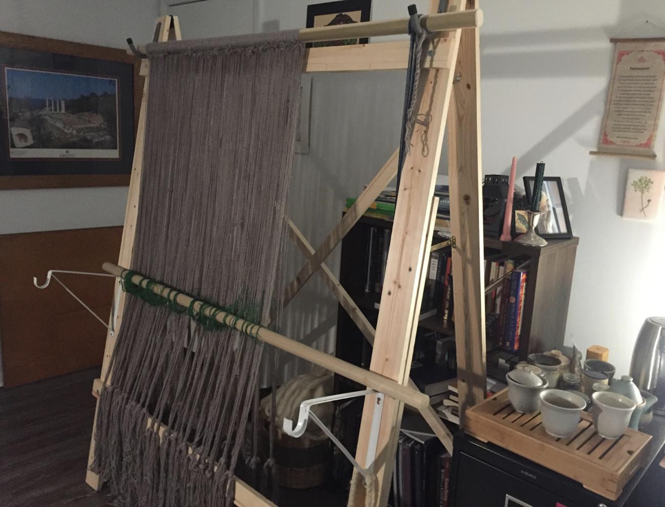 The loom (histos) is not based on a single specific classical example, but, rather, conforms to examples proposed by other scholars as well as an understanding of the properties of single heddle warp-weighted looms (Mårtensson, Nosch, and Strand, 2009, p.374; Foxhall, 2016; Carroll, 1983; Gleba and Mannering, 2019, p.15). The loom used for this experiment is made out of modern materials, with dimensional lumber and metal arms in place of what would have been wooden pieces. While the materials are different, the function of the loom is not; although these modern materials could have some affect on the friction and process of weaving. This style of loom is a single heddle warp-weighted loom or a vertical loom using hanging ceramic weights to create tension (Carroll, 1983; Hooper, 1911). The loom can be taken down, folded, and reassembled even with a weave in mid-progress. An example of the loom used for this project and the heddles in use can be seen in Figure 1 and 2.