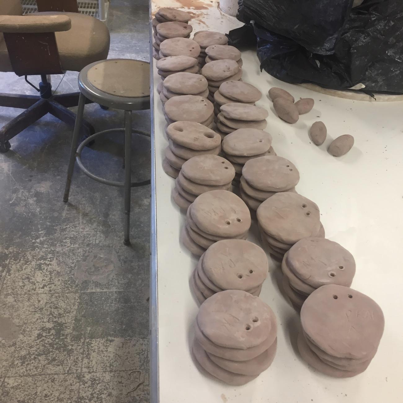 The loom weights (laiai) replicated various classical examples and were fired to the temperatures of pit firing, thus mimicking ancient firing techniques of loom weights and ensuring accurate replication (Foxhall et al., 2016; Meo, 2014; Mårtensson, Nosch, and Strand, 2009). The 77 weights used in this experiment are discoid loom weights, averaging about 180 grams in weight, and made by hand, using a lower quality blended clay like the local clays that would be used (Ulanowska, 2018, p.165). Since the loom weights were varied in size and weight, they each took a varied amount of threads, a process which has been noted by Karavidović and Ivančan (2018). All but three of these weights are very similar, the main type of weights are discoid, with two small holes near the top of the weight. The three weights that are different feature one or two large holes made by a human finger, although they are still within the weight range of the others. Since these are handmade, there is some variety in size, thickness, and weight, to replicate real weaving conditions, skills, and the range of weights rather than strict replicas (See Figures 3 and 4).