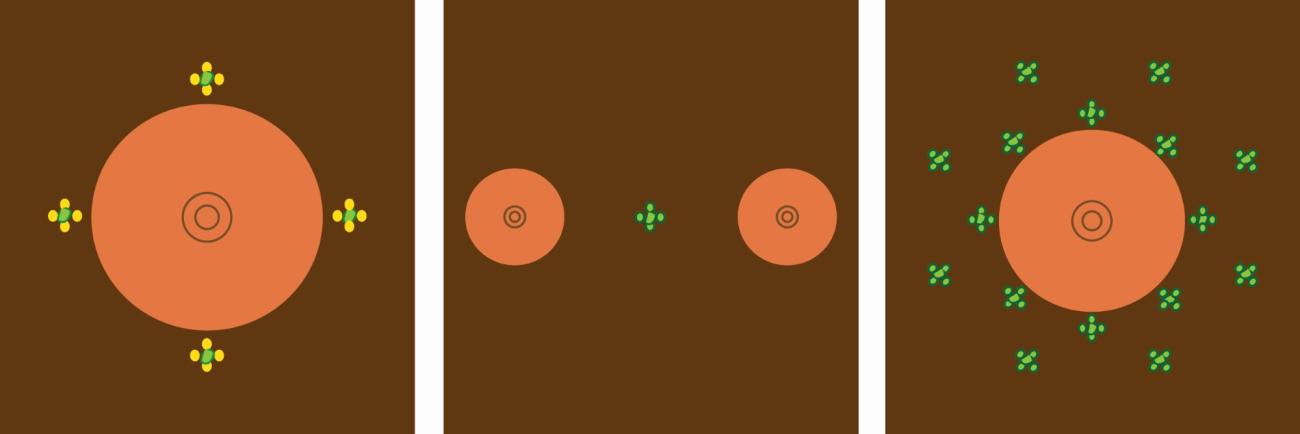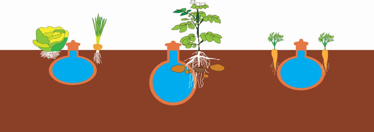 Clay pot irrigation, also referred to as pitcher irrigation, is an ancient sub-surface irrigation system based on locally manufactured clay pots buried in the ground. Seeds or seedlings are planted close to the pots, which distribute water directly to the plant roots saving between 40% and 90% of irrigation water. Different planting patterns are recommended depending on the characteristics of the plants intended for growing (See Figures 1-2).